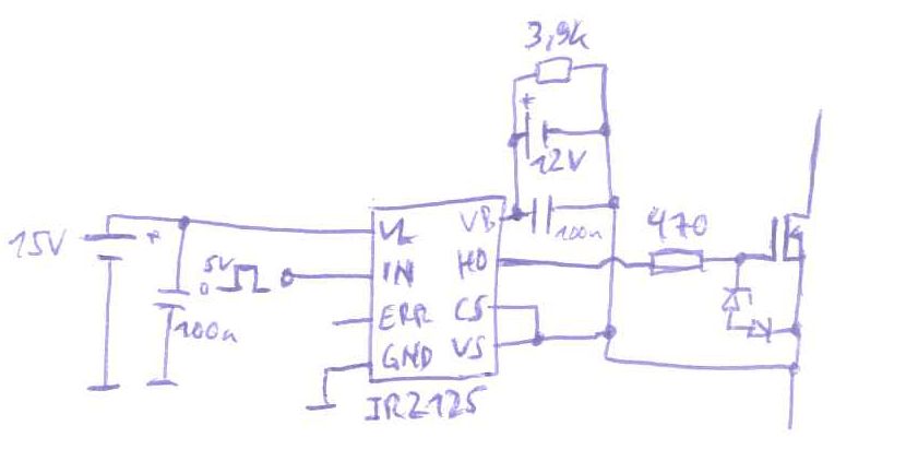 Hallo Experten, ich habe seit einiger Zeit ein Problem mit dem IR2125 MOSFET-Treiber. Die Eingangsspannung (VCC=15V), der Pegel an IN (VIN=5V) und die Highside Versorgungsspannung (VB=12,5V) sind soweit in Ordnung, allerdings bleibt die Highside Ausgangsspannung immer auf 0V. Der MOSFET am Ausgang ist damit immer gesperrt. Ich habe schon den IC getauscht - leider ohne Erfolg. Kennt jemand so ein Verhalten aus Erfahrung, oder weiß was nicht in Ordnung sein könnte? Ich werde die Schaltung später nachreichen. Danke und Grüße, Albert83