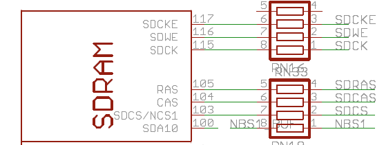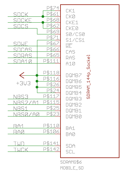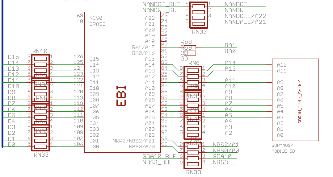 Hallo, um auf meiner AT91SAM9XE- Platine etwas Platz zu sparen habe ich das SDRAM eines alten Laptop genommen (144pin Mobile SDram von NEC, Beschriftet mit MC-402-A10B, 9840F8S98, 64MB-64/E-A-1.0). Nach dem Bestücken meckert SAM-BA beim Initialisieren des SDRAM. Kann jemand die Verbindungen (s. Anhang) überprüfen? Die EBI und SDRAM Blöcke sind direkt vom Prozessor, Signal_BUF ist vor den 33Ohm Serienwiderständen. Nicht abgebildet sind die Datenleitungen D0..D31, die 1:1 verbunden sind, D32..D63 des SODIMM hängen in der Luft. Ein neukompilieren von board_memories.c der at91lib führte nur dazu, dass sich SAM-BA beim Start (also wahrscheinlich in der neuen isp-extram-at91sam9xe.bin) Ideen? Der Beitrag Beitrag "SD-RAM aus PC für AT91RM9200 (ARM9)" hätte getroffen, jedoch gibts das pdf nicht mehr ... schönen Tag noch!