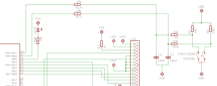 Hallo Leute, Aufgrund meines Layoutes habe ich keine anderen Portpins mehr frei, um einen Encoder an einen PIC18 anzuschliessen. Kann ich die ICSP Schnittstelle mit der angehangenen Schnittstelle benutzen, oder werden die Leitungen durch die Kondensatoren vom Encoder zu stark belastet? Brenner ist ein Brenner 8 von Sprut. mfG Root