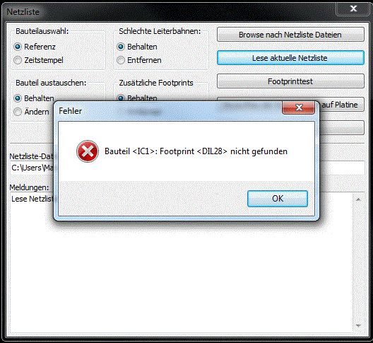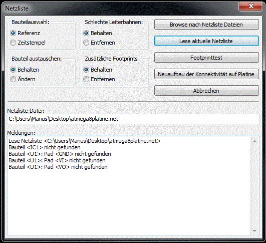 Hallo zusammen :) Ich mache gerade meine ersten Gehversuche mit KiCad und bin dabei einfach mal ein Testlayout zu erstellen das in der Realität NICHT funktionieren muss (also einfach einen Mega8 und nen Spannungsregler irgendwie wild verbunden;)) Ich führe folgende Schritte aus: 1.) Zeichne einen Schaltplan 2.) Annotation durchführen 3.) Netzliste generieren 4.) In der Netzliste alle Footprints zuordnen 5.) in PCBnew die Netzliste öffnen, wenn ich dann auf "lese aktuelle Netzliste" klicke bekomme ich die Fehlermeldung aus dem Anhang An was liegt das? was mach ich falsch?:D Bitte helft doch einem kleinen Anfänger;) Liebe Grüsse