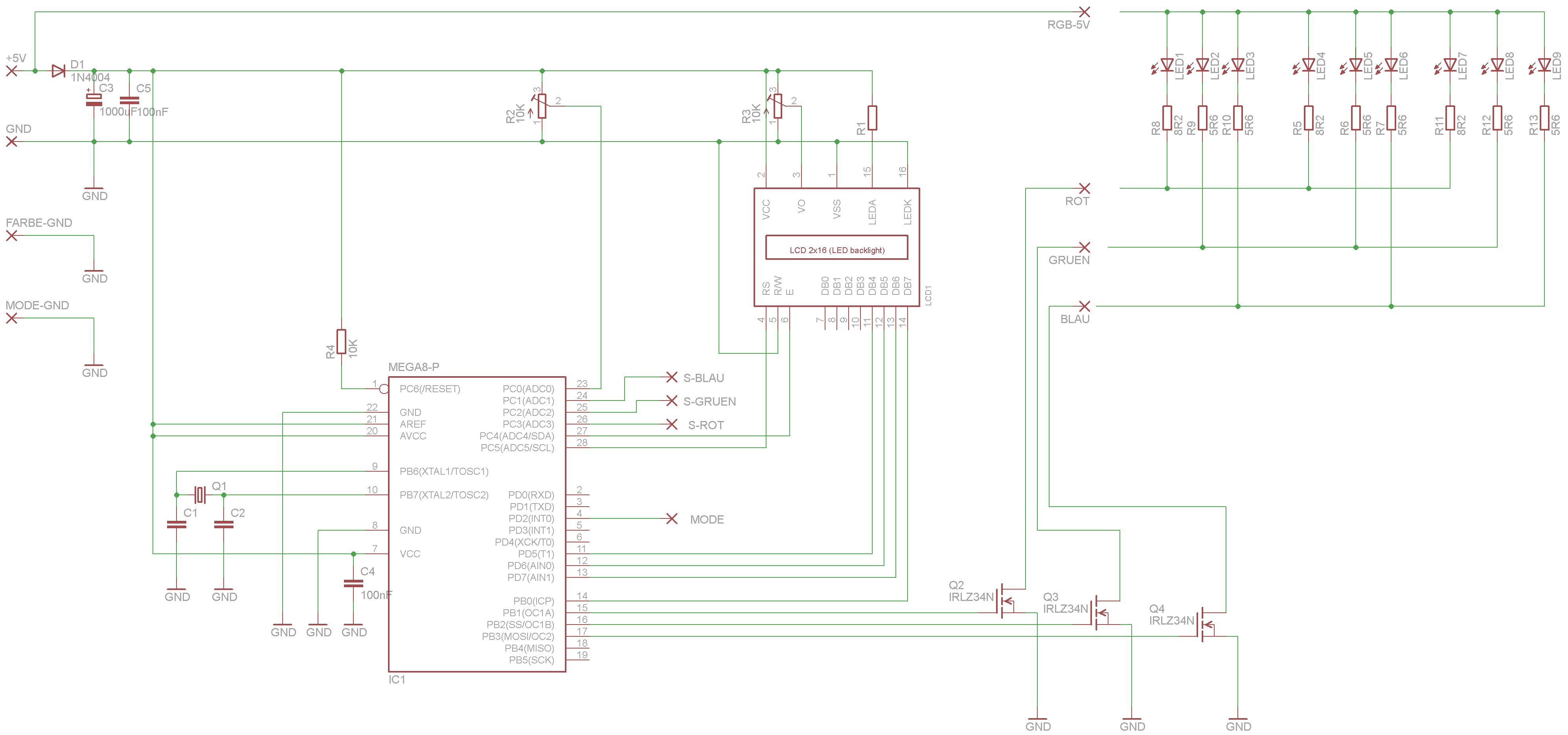 So damit man doch etwas lernt....oder versucht.. ich habe mal jetzt alles gezeichnet, weil mein Nachbar auch so ein Teil haben will, werde ich doch noch eine Platine ätzen lassen. Bevor ich das Zeug route, bitte Blick drauf werfen. Noch etwas. Die Schaltung wird über ein Steckernetzteil 5V 3500mA gespeist, habe noch welche übrig. die RGBs sind auf einem 55x55mm grossen Kühlkörper einzeln aufgebracht 3 Stück paralell. RGBs sind 3 Watt Typen. Der Poti bestimmt die Geschwindigkeit im Fade Modus mit der 3 Tasten stelle ich die Farben einzeln ein. Die Werte werden gespeichert und die Infos an 16x2 LCD ausgegeben. der IRLZ wird nicht mal handwarm. So jetzt bin mal gespannt !!!