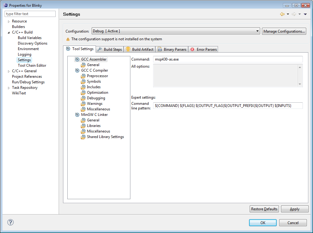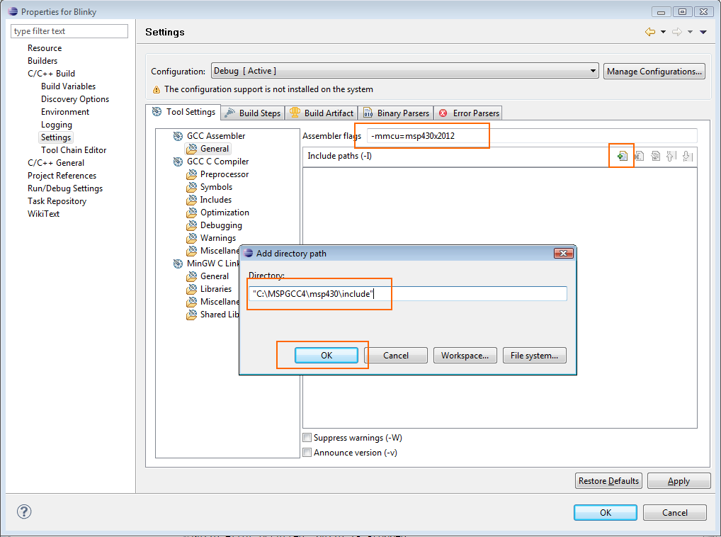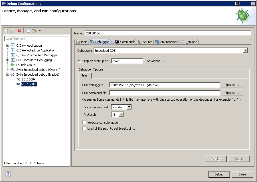 Hallo zusammen, versuche gerade das Code-Beispiel für das msp430f449stk2 von Olimex mit GCC4 und Eclipse zum laufen zu bringen. Code Beispiel: http://dev.ivanov.eu/projects/msp430-449stk2_sample/index.html Tool Setup: Eclipse (IDE for C/C++ Developers / Build id: 20090619-0625) GCC4 (20100218-msp430-gcc-4.4.3-gdb-7.0.1-insight-6.8.exe) Tool Installation nach: http://springuin.nl/en/articles/launchpadwindows Compilieren funktioniert (20110606 ist der Projektname):