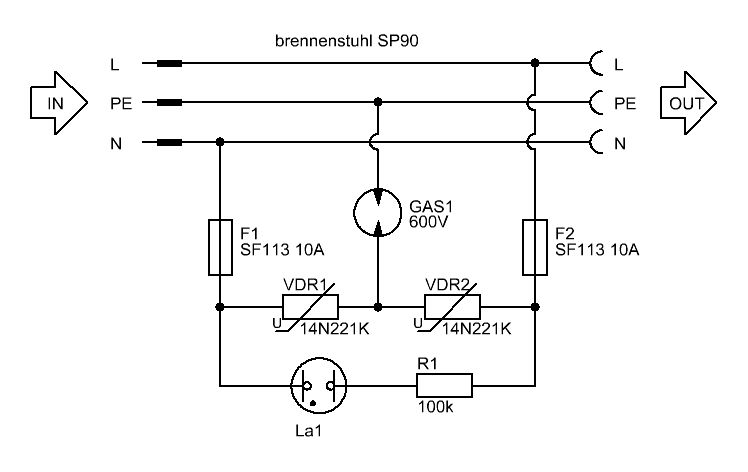 @ Bernd das Brot (Gast) >Würde es helfen, mehrere (z.B. 10 Stück) dieser Protectoren >hintereinander zu schalten? Nein. Ein guter Schutz gegen indirekten Blitzschlag baut man nicht mal nebenbei. Ausserdem sieht der anders aus. Siehe Anhang. Die Gasableiter zünden erst nach ca. 0,5-1us, währenddessen marschiert die Spannung dort hoch. Die Längsdrosseln verhindern ein schnelles Ansteigen des Stroms, die Varistoren regieren im einstelligen Nanosekundenbereich, können aber nicht sooo viel Ampere. Wenn die Gasableiter zünden sind die Varistoren entlastet. Das ganze braucht aber in Richtung Netz eine Sicherung, denn die Gasableiter machen einen Kurzschluss, solange Strom fließen kann. Einen direkten Blitzeischlag überlebt sowieso nichts ;-) MFG Falk