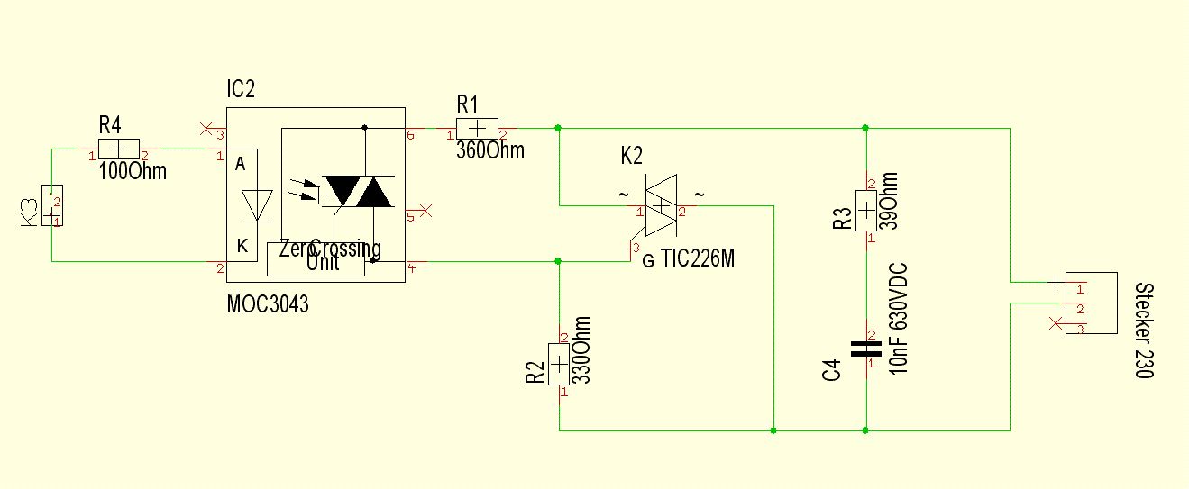 Ich hoffe, ich verstehe Dich richtig: Es genuegt, den Vorwiderstand der LED (R4) so anzupassen, dass bei 3,3V ein genuegend hoher LED-Strom fliesst (siehe Datenblatt des MOC). Bei Motoren ist das Snubberglied R3|C4 unabdingbar; die Zero Crossing Unit im Optokoppler waere hingegen verzichtbar (schadet aber auch nicht).