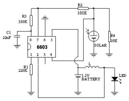 Ich bin auf der suche nach technischen Daten (Datenblatt) oder Schaltbeispielen für den Schaltkreis IC 6603 von Shenzhen und Technology Co., Ltd. Dieser IC enthält einen Ladecontroller für ein bzw. zwei Akkuzellen (1,2V; 2,4V) und kann 20, 30 oder 50 LEDs (parallel geschaltet) ansteuern. Wie ich mittlerweile heraus bekommen habe, ist der IC in vielen Gartenbeleuchtungen (Lichtrerketten und -netze, alle möglichen Figuren, Orietierungslampen usw. usf.) enthalten. Alles googel hat bisher nichts gebracht, außer die Skizze (siehe Bild). Wäre schön wenn mir einer weiter helfen könnte.