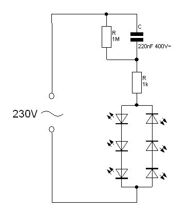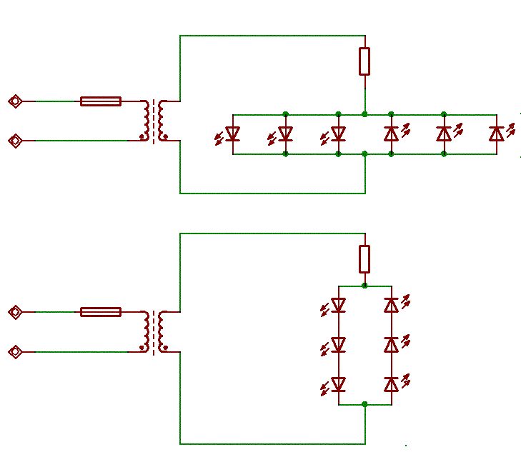 Diese Schaltung funktioniert zwar, aber sie ist nicht das Wahre (direkt am Lichtnetz)! Schau mal bei Reichelt oder Conrad, da gibt es ganz kleine vergossene Trafos mit teilweise weniger als 5VA. Wenn so einer passt empfehle ich dir diesen zu nehmen! Der Vorteil dabei ist die galvanische Trennung vom Lichtnetz, was die Sache wesentlich ungefährlicher macht. Hierfür brauchst du nur wenig mehr Bauteile. Ein Gleichrichter ist nicht notwenig, wenn du die LEDs in gleicher Anzahl antiparrallel schaltest. Hierzu zwei Vorschläge im Anhang, je nachdem, wie die Ausgangsspannung des Trafos ist. I.d.R. haben die kleinsten ca. 6-9V~ Ausgangsspannung. Da ist die untere besser. Nicht vergessen den Widerstand so auszulegen, dass bei dem Maximalwert der Spannung der max. Pulsstrom durch die LEDs nicht überschritten wird! Gruß Henrik
