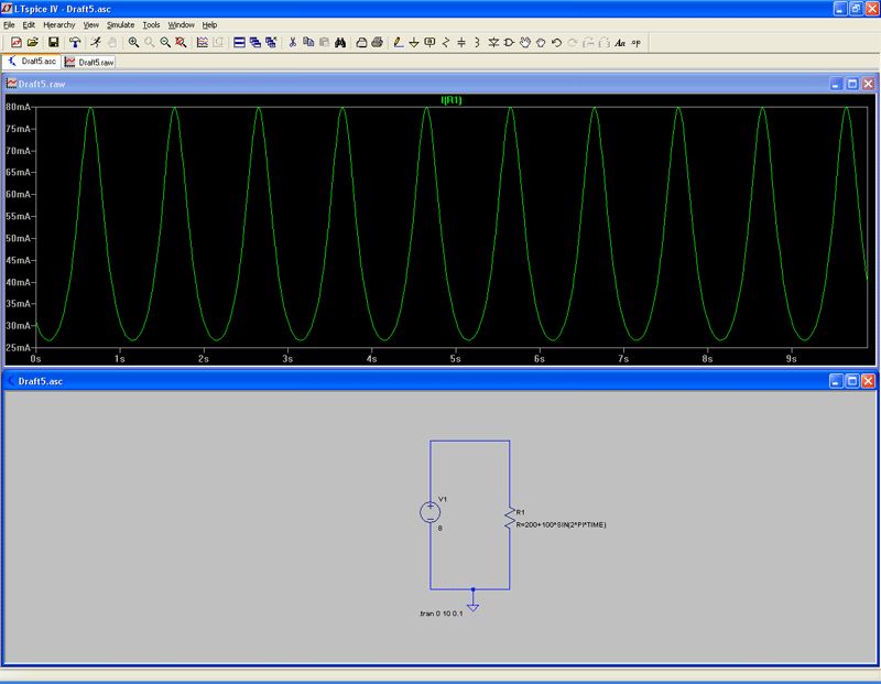 I = U/R Wenn I sinusförmig sein soll, dann muss R(t) eine Funktion mit 1/sin(t) sein. R=1k/(2+1*SIN(2*PI*TIME))