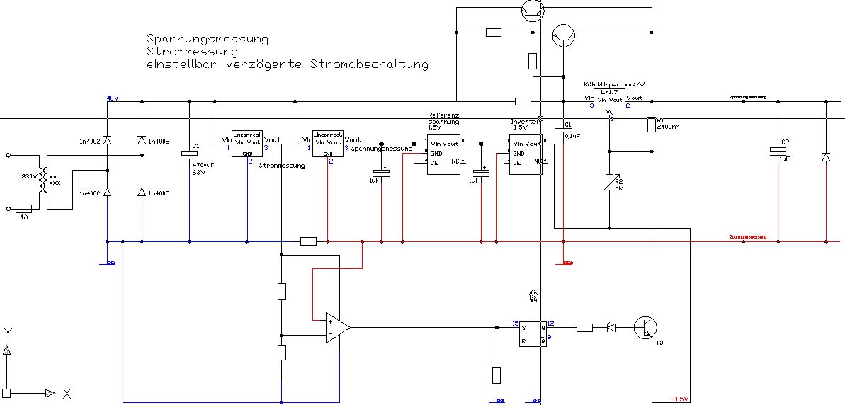 Hallo, im Anhang meine Schaltung! Sollte ein Netzgerät 0-30V 0-3A mit Spannungsanzeige, Stromanzeige und einstellbare Stromabschaltung werden. Kurz zur Schaltung: Wichtigstes Bauteil ist der lm117 für die Spannungsregelung. Dieser wird auf -1,5V gelegt um am Ausgang auf 0V zu kommen. Leistungstransistoren werden verwendet um auf 3A zu kommen. Die beiden Linearregler werden verwendet um das Spannungs/Strommessgerät zu versorgen. Über den Shunt wird der Strom gemessen und bei zu großen(einstellbaren)Strömen wird der lm117 auf -1,5V gelegt, die Spannung ist Null ***Schaltung so in Ordnung? Verbesserungsvorschläge?? Nun zu meinem Problem: Über dem Shunt fließt nicht nur der Ausgangsstrom sondern auch die Ströme des Linearreglers, Spannungsreferenz 1,5V+Inverter! ***Wie kann ich die Stromabschaltung/Strommessung anders lösen? DANKE DANKE DANKE :)*