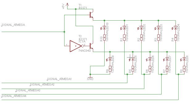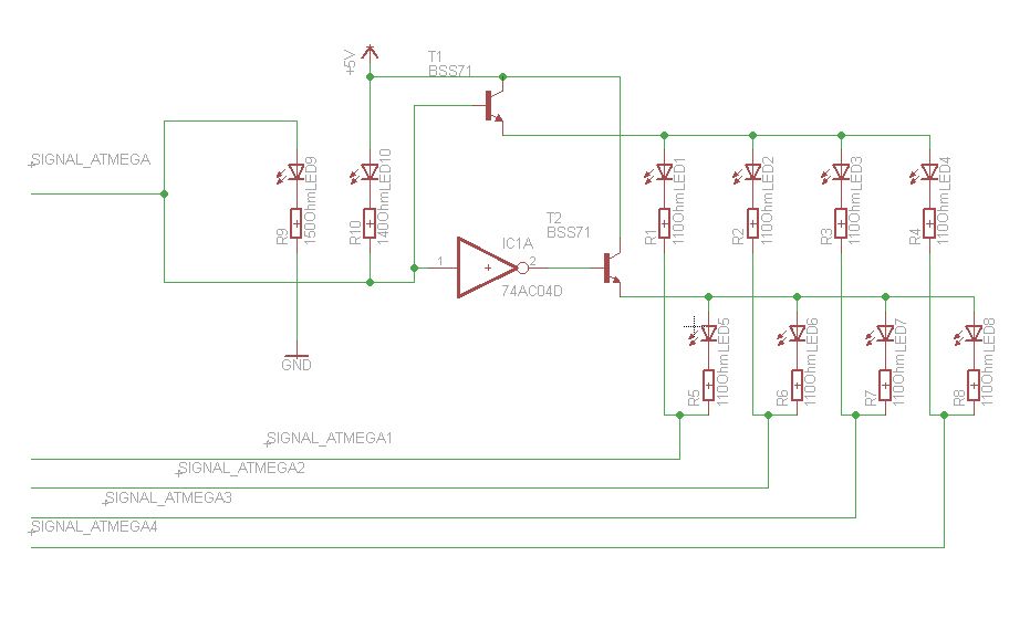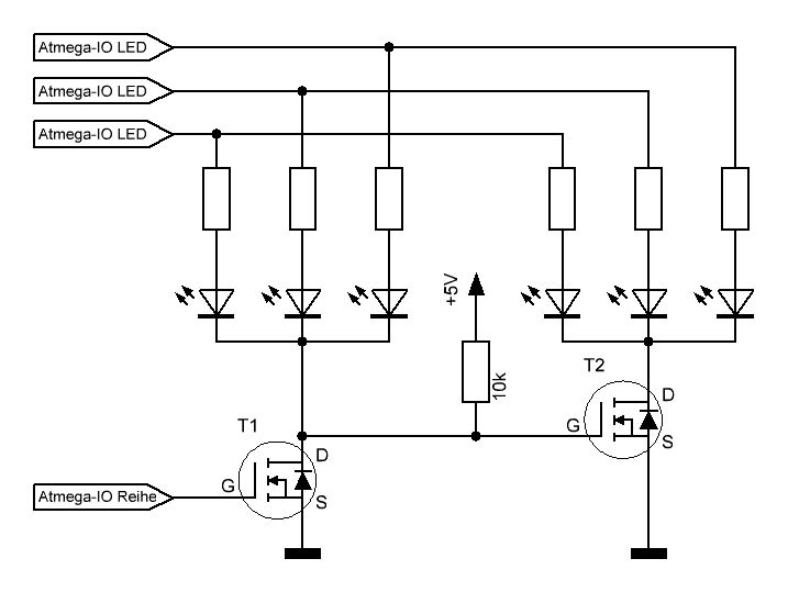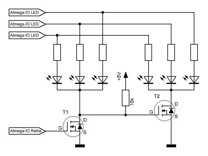 Hallo, dürfte ich bitte auch noch erfahren wieso meine Schaltung nicht funktionieren wird? Eigentliche sollte je nach High oder Low Pegel, die eine Reihe oder die andere Reihe Leds bestromt werden. Das soll auch durch LED9 bzw. 10 angezeigt werden. Zusätzlich sollen dann die einzelnen LEDs einer Reihe durch auf Masse ziehen mit dem ATmega geschaltet werden können. Eine Aufklärung wäre sehr hilfreich. Danke Ps: Ich habe das Ganze noch mal etwas abgeändert, verstehe aber immer noch nicht, warum meine erste Variante nicht gehen solle