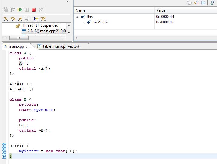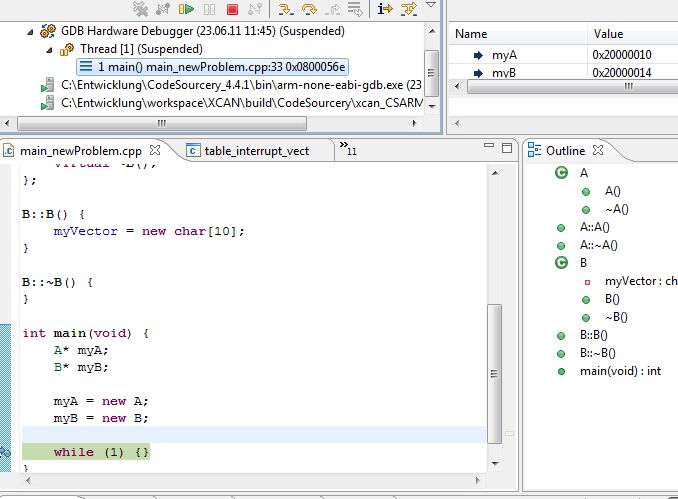Hi, auf einem kleinen C++ - Projekt (ich verwende CodeSourcery g++) für den STM32F103RE habe ich den Versuch unternommen, einen eigenen globalen new-Handler zu schreiben (um nicht die Standard Libs einbinden zu müssen). Bislang klappt das Allokieren ganz gut. Allerdings klappt das Allokieren von Speicher im Konstruktor schlicht nicht. Ich habe das Problem in einem Beispielprogramm rekonstruiert (main.cpp). Das RAM liegt beim STM32F103RE im Bereich $20000000 bis $2000ffff. Die Allokation für myA klappt, für myB liefert er mir einen Zeiger vom Stack :-( -> Screen Shot: main_debug.jpg Wenn man den Konstruktor von B durchgeht, sieht man, daß das Objekt offenbar richtig allokiert wurde (this) und auch für myVector die Allokation geklappt hat. Nur beim Rücksprung geht die Info über this anscheinend wieder "verloren". -> Screen Shot: main_debug2.jpg Die Speicherallokation selbst wird in mini_cpp.cpp vorgenommen. Aber warum? Kann jemand helfen? Grüße schnack