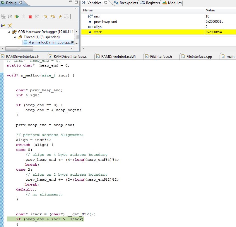Hallo Ralf, ich fürchte, daß es keine Fehlinterpretation ist. Das Programm main.cpp ist auch nur die kondensierte Fassung des Problems. Tatsächlich haben sich die Probleme im eigentlichen Projekt beim Aufruf virtueller Funktionen gezeigt, die überhaupt nicht funktionierten (führten auf dem STM32 direkt zu einem 'Hard Fault'). Nach langer Sucherei habe ich dann gemerkt, daß der Aufruf für diejenigen Objekte fehlschlägt, bei denen das new() nicht funktioniert hat (weil sie im Konstruktor eigenen Speicher vom Heap allokieren) und dann dieses Kurzbeispiel zusammengesetzt. Ich habe inzwischen herausbekommen, wie der Wert für den Zeiger myB zu interpretieren ist: es ist die untere, aktuelle Stack-Grenze. Der Screen-Shot zeigt den Durchlauf durch p_malloc(), aufgerufen in