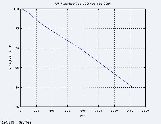 > Hast du deinen Aufbau mal mit einem konstanten Strahler überprüft? Eine > Glühlampe könnte ich mir gut vorstellen. Ne, hab ich nicht. Ich vertraue meinem Aufbau. :-) > Wenn für die Messungen eine Fotodiode im Plastikgehäuse verwendet wird, > dürfte sich auch dort eine sinkende Empfindlichkeit aufgrund von > UV-induzierter Materialalterung ergeben. Ich verwende fuer die Messung eine IR-LED im Plastikgehaeuse weil ich gerade keine Photodiode rumliegen hatte. Grundsaetzlich kann sowas natuerlich auch einen Einfluss haben! Aber wenn ich in ein paar Tagen angeblich 0% Intensitaet habe und ich mache den Deckel wieder auf und die Diode leuchtet noch dann weiss ich ja das es so war. > Eine Vergleichsmessung mit einer neuen UV-LED, die immer nur kurz als > Referenz verwendet wird, könnte hier Klarheit schaffen. Aber nur theoretisch. Das Problem ist das die Empfindlichkeit meines Empfaengers STARK von der Ausrichtung von Sender und Empfaenger abhaengt. Sobald ich da irgendwas fummel ist die Sache nicht mehr vergleichbar. Dazu muesste man schon etwas mehr Arbeit reinstecken und ich wollte ja nur kurz was testen und keine Doktorarbeit raus machen. > Ich würde sagen das liegt an den Platinen. Meiner Erfahrung nach > brauchen meine alten Platinen immer um ein vielfaches länger. So bloed bin ich nicht. Ich hab es extra mit einem Stueck Platine getestet vom dem ich vor ein paar Wochen die andere Haelfte benutzt habe. Olaf
