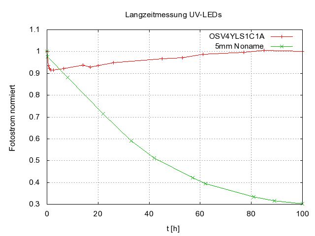 @Lose: Laut Datenblatt eignet sich die Fotodiode für Messungen im Wellenlängenbereich von 350 bis 1100nm. Die UV_LEDs liegen da so bei 400nm. Die Fotodiode hat hat auch kein Plasikgehäuse sondern eines aus Metall mit einem Glasfenster. Weiters zeigt ja das Bild mit dem direkten Vergleich einer neuen und der 100h-belasteten LED, dass die LED dran schuld ist und nicht die Fotodiode. Die "OSV4YLS1C1A" zeigt ja diesen Alterungseffekt eh nicht, weshalb ich mir jetzt weitere davon bestellen werde. Zudem haben diese eine Abstrahlwinkel von 120° und eignen sich so besser für eine flache Bauweise des Belichters. Was noch auffallend war, ist die unterschiedliche Durchlassspannung. Die 5mm Diode hatte ca. 3,7V, die "OSV4YLS1C1A" eine von ca. 3,2V. Möglicherweise sind sie also in verschiednen Technologien gefertigt.