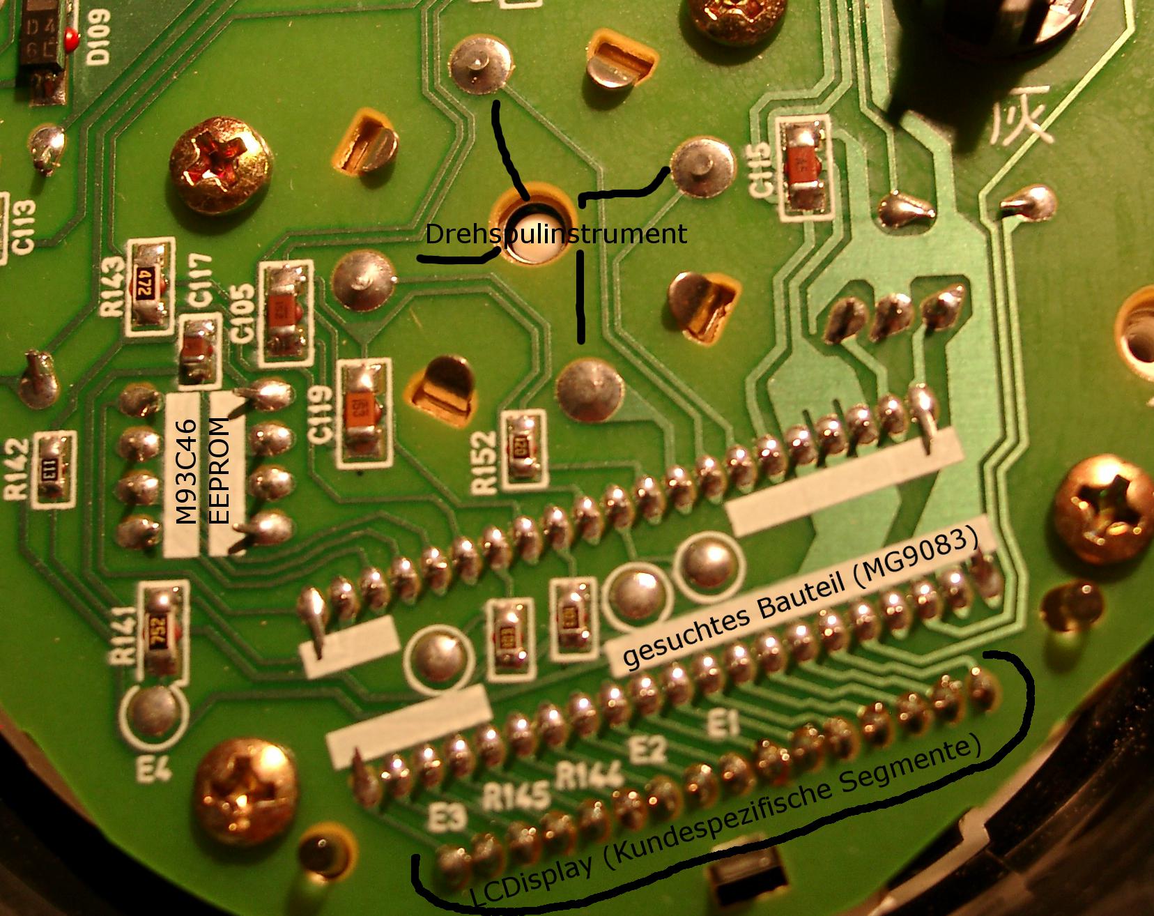 Es sind keine Grafik LCDs ! Dann liefer ich nochmal ein paar Details. Vielleicht hilft es ja. Auf dem angehaengt Foto (ohne Rahmen, 'tschuldigung :D) ist die Lötseite der Platine zu sehen. An dem Bauteil, das ich Suche ist ein Drehspulinstrument, ein EEPROM (93C46) und das LCD Display angeschlossen. (zusaetzlichein paar Signale, die ich noch nicht weiter verfolgt habe (muss ich heute abend mal machen.) Vielleicht hilf das ja jemandem, mir zu helfen :) Many thanks! MfG, Balze aka AVR Noob