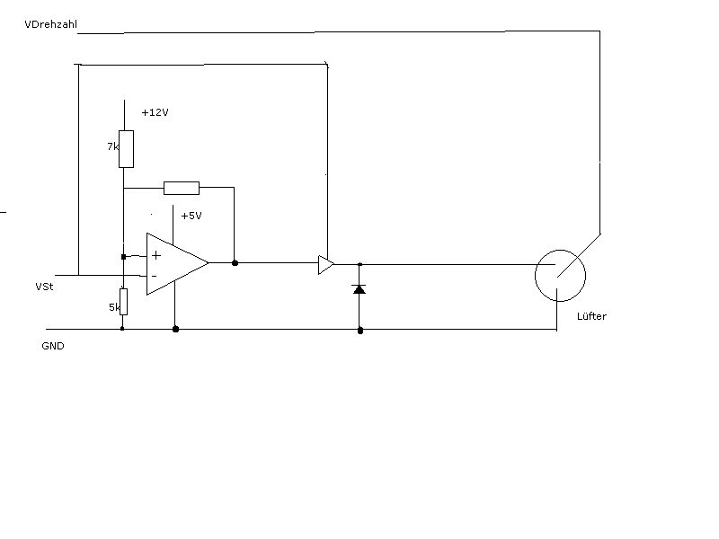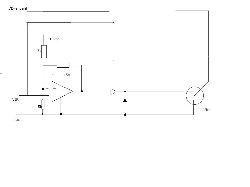 Bevor jetzt ein "geh suchen" kommt :) Ich will keine Lüftersteurung aufbauen, sondern eine vorhandene (kauf-) steuerung erweitern. Und zwar regelt diese Steuerung bis auf 2000 Umdrehungen runter, was einem Spannungswert von 5V enspricht. (klingt wenig professionell, aber so stehts in tests und beschreibungen des Teils). Allerdings schaltet die Steuerung den Lüfter nicht komplett ab, was ich jedoch möchte. Ich gehe erst einmal davon aus, daß das Feedback über die Drehgeschwindkeit nicht ausgewertet wird. Mein Gedanke hinter beiliegendem Schaltplan ist nun folgender: Über einen Schmitt-Trigger erkenne ich, ob min. 5V anliegen. Falls ja werden Diese über einen Treiber zum Lüfter geleitet. Falls nein, kommt halt nix an beim Lüfter. (Ich hoffe, das Schaltzeichen vom Treiber ist in etwa richtig, habs aus Datenblättern erraten) Hab ich endlich mal keinen Denkfehler? ;) Angenommen, die Steuerung wertet doch das Drehzahlsignal aus und jagt die Spannung quasi automatisch wieder hoch: Ist das Signal einfach eine analoge Spannung im Bereich 0-12V oder sind es digitale Informationen? Danke schonmal