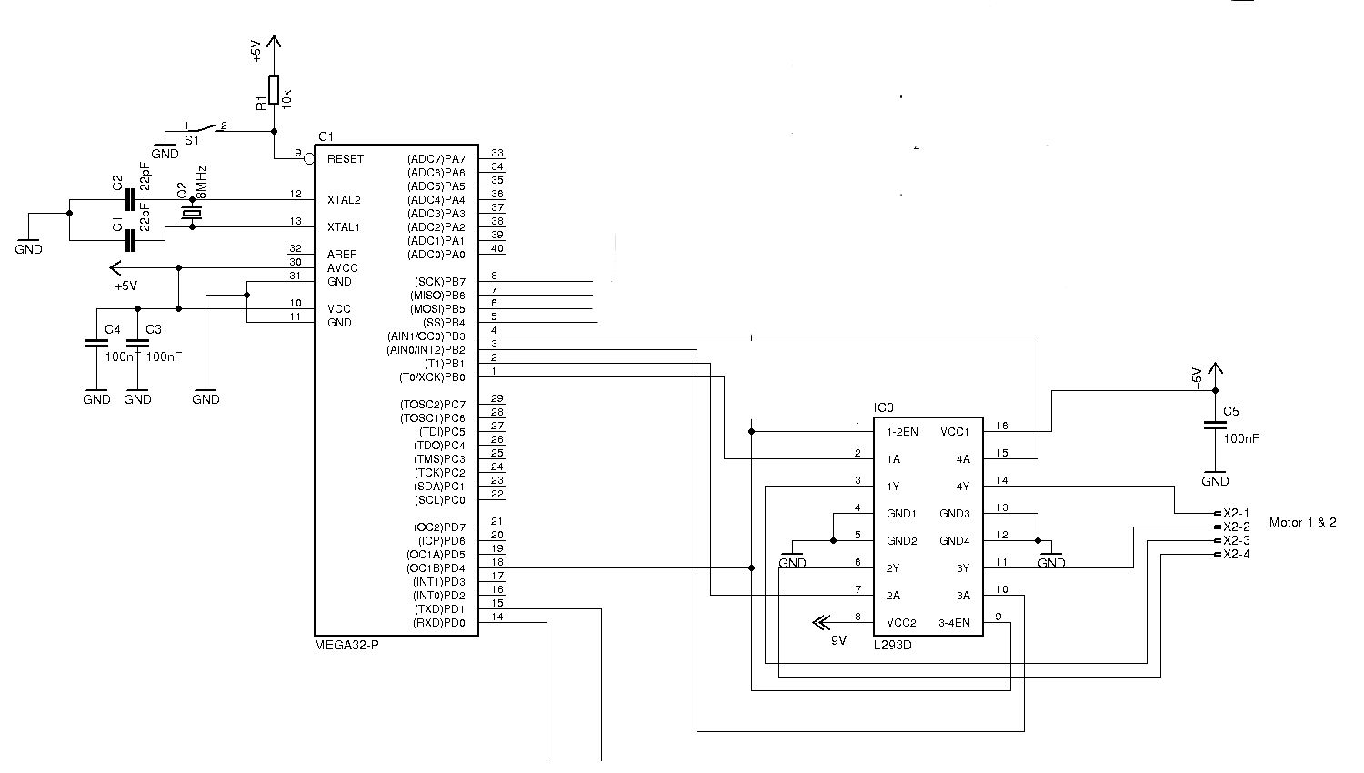ich habe mal deine Schaltung etwas erweitert. Spannungsregler 1 für den AVR und Spannungsregler 2 für deine Motoren. Schau da mal in die Datenblätter was für einen Elko die am Ausgang empfehlen 680µF ist sicherlich zu viel das bremst nur die Regeleingenschaften, denke eher so 10-50µF. In deiner Resetbeschaltung fehlte der Kerko und Atmel empfiehlt dazu eine Diode damit sich dieser beim Abschalten nicht über den Resetpin entlädt. Jeder Spannungsregler hat eine eigene Drosselspule damit es nicht zu Rückwirkungen auf den anderen kommen kann. Beim Spannungsregler für die Motoren kannst du evtl. die Induktivität auch höher wählen schau einfach mal welchen Wert du für eine Belastbarkeit von 1A bekommst. Weiterhin hat jeder Spannungsregler eine Diode bekommen damit es nicht zu einer ungewollten Entladung durch den Regler kommen kann z.B. wenn beim Abschalten der Spannung ein Motor noch ausläuft und eine Spannung induziert kann es dir den Spannungsregler killen. AVCC hat auch eine Drosselspule wie es Atmel empfiehlt, das gleich kannst du auch für VCC machen und möglichst nah an den µC. Ich habe eine Steckbrett mit dem µC direkt neben einer Zündspule und -funken der µC resetet nicht, also selbst ohne Kondensatoren an den Motoren müsste dein µC damit laufen. Und den Ausgängen würde ich noch einen Widerstand > 250 Ohm spendieren dann passiert auch nichts wenn du da mal nen kurzen verschaltest.