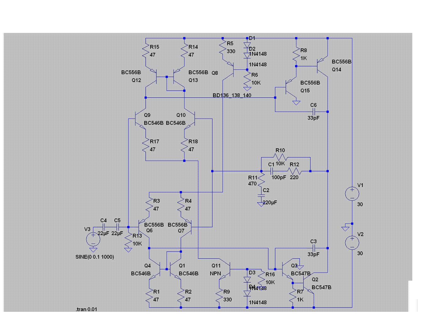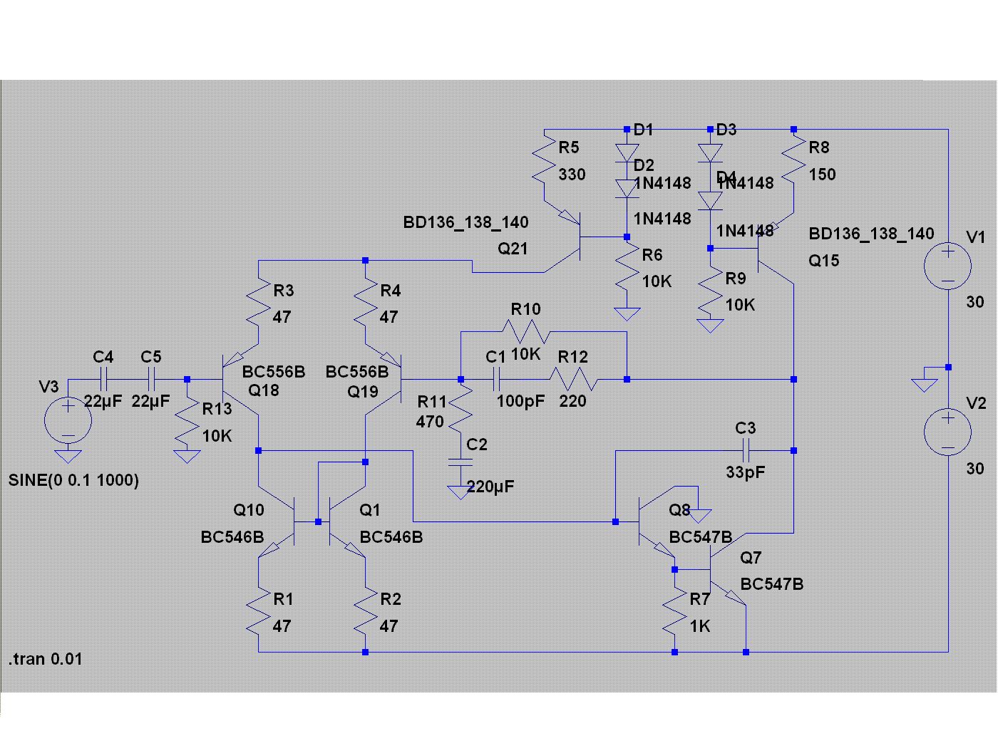 Hallo, ich hatte mich selber vor ca. 15 Monaten mit dem Thema "Verstärker" beschäftigt da ich meine in den Jahren gekommenen, selbst entwickelten Aktivboxen auf Vordermann bringen wollte. Gerade die Eingangsstufe ist für einen Verstärker wichtig. Ich habe zahlreiche Recherchen im Internet durchgeführt und auch letztlich ein ganz interessantes englisch sprachiges Buch mir ausgeliehen. Um es abzukürzen, ich habe es verworfen solche Eingangsstufen und Treiber diskret aufzubauen. Es bringt nichts, ausser man will dadurch Erfahrungen sammeln. Ich würde für eine analoge Endstufe einen LME49811, LME49811 oder LME49830 nehmen. So gut wie die Profis von National Semiconductor bekommt das kaum einer hin. Die ICs kosten bei Mouser um die 12-15 Euro. Zu dem gibt es dann damit noch genug zu tun. Deine Differenzverstärker sind gänzlich nicht optimal. Die ersten Transistoren sollten FETs sein. Damit verbessert sich der Klirrfaktor. Ich habe erst in den letzten Wochen einen aktuellen Tietze/Schenk, 13. Auflage, in der Hand gehabt. Ältere Auflagen kannte ich schon und ich hätte nicht vermutet das man da auch Quantensprünge machen könnte. Ich glaube schon die 12. Auflage behandelt das Thema Differenzverstärker bis auf das Feinste. Alles was ich wissen wollte habe ich dort wiedergefunden. Aber dort geht man noch weiter. Zum Thema LTSpice. Ohne vorherige Simulation mit LTSpice werde ich keinen Lötkolben mehr anpacken. Gerade bei Differenzstufen stocherst Du sonst nur im Dunkeln. Wenn eine Simulation mal langsam wird, dann gibt es hier im Forum auch Hilfe. Es gibt ein paar Threads mit Tipps, z.B. den alternative Solver zu nehmen und ggf. Parameter zu ändern. Ich habe hier zwei Beispiele: .options gmin=1e-10 reltol=0.003 .options gmin=1e-12 abstol=1e-10 reltol=0.003 Gruss Klaus.