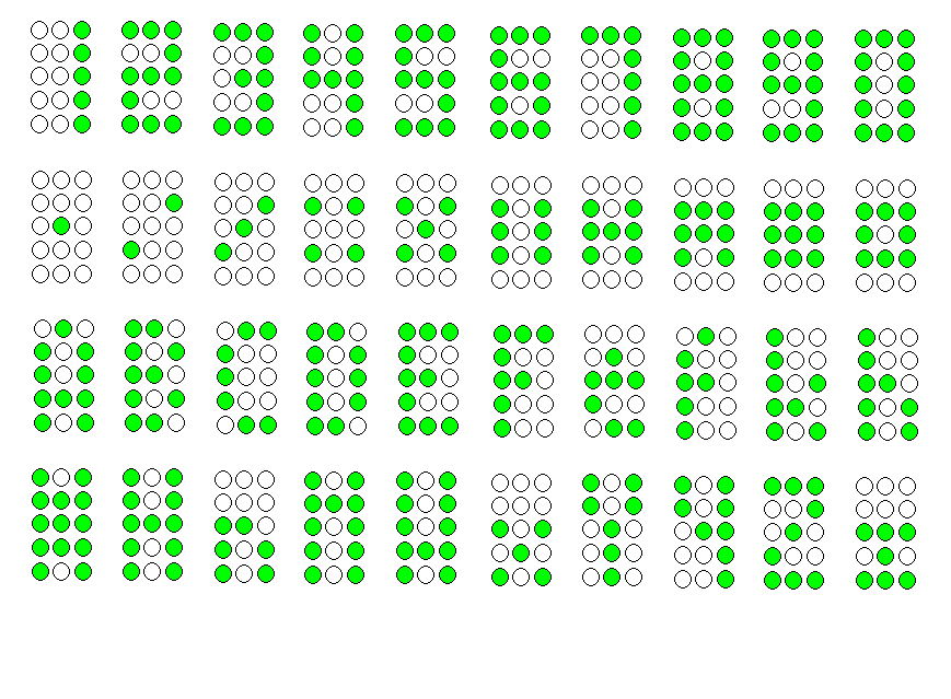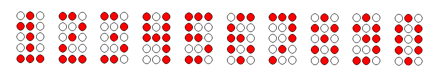 Hi, ich möchte auf einem um 90° gedrehten TA 07-11 RT :: Dot-Matrix-Display, 5x7 Pkt., 6,4mm, rot, Anode zwei Zahlen darstellen. Dazu brauche ich einen 3x5 Zeichensatz. Nicht alle Zeichen die ich erstellt habe sehen wirklich gut aus. Gibt es bessere Vorschläge?