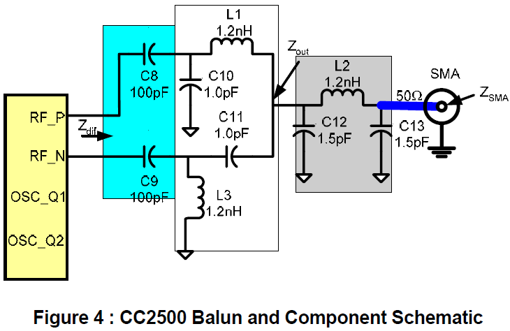 Die Schaltung wird ausführlich in der TI Appnote beschrieben. http://focus.ti.com/lit/an/swra236a/swra236a.pdf Das "Pi matching filter" wird in Kapitel 7 beschrieben. Für mein Verständnis dient es zur Anpassung (Matching) und wird dementsprechend ausgelegt...