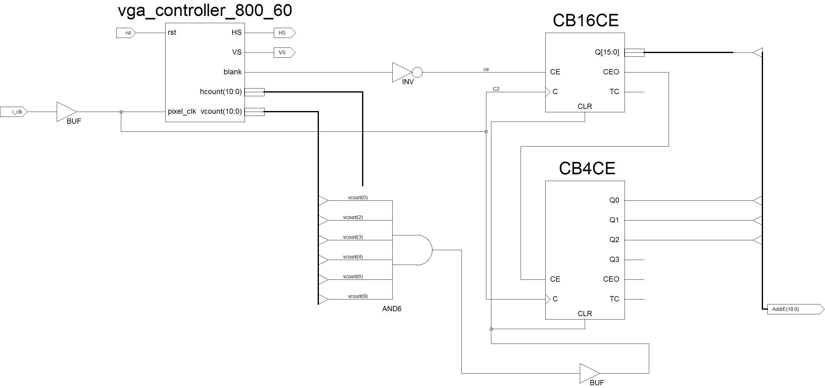 Fehler gefunden. Das AND für CLR muss 5 Kanäle haben für die Signale vcount2,4,5,6,9 Dumm, dass man den kurzen Impuls im Simulator nicht sieht. Hat jemand vielleicht noch eine bessere Idee zur Adressierung?