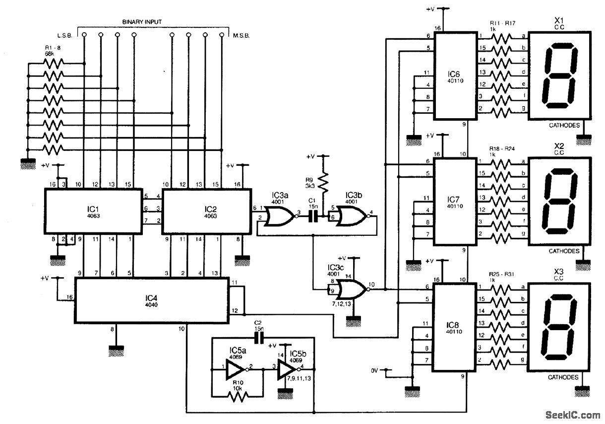 Hallo zusammen! Ich möchte ein 8-Bit-Signal ins Dezimalsystem umwandeln und auf einer 7-Segment anzeige wieder geben. Das ganze wollte ich möglichst ohne µC machen. Ich hatte schon an eine Schaltung mit dem 4543 gedacht, der zeigt allerdings nur Zeichen von 0-9, aber 8 Bit sind nunmal 256 Zeichen... Kann ich mehrere 4543 so beschalten, dass sie die Zahlen von 0-256 auf 3 7-Segmentanzeigen darstellen? Danke! Nils K.