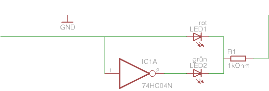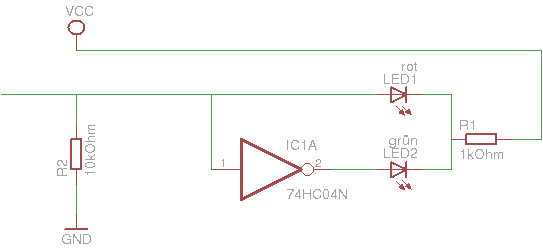 Der offene Eingang wird auch nicht LOW, weil R1 mit LED1 (wenn sie richtigrum gepolt ist) kräftiger hochzieht, wie der Pulldown runter. Also am Besten, noch ein Gatter als Puffer, davor, im '04 sind ja noch 5 freie drin... Alternativ, die LED's gegen Masse. mfG ingo