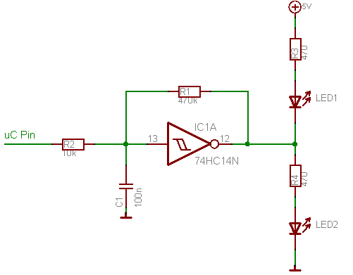 Naja, schnelle wechsel des uC Ausgangs sollte meine Schaltung doch auch können, solange "schnell" nicht schneller als alle 5 ms ist, oder liege ich da falsch? Es geht mir bei der Schaltung eigentlich erst mal darum, einfach die Ausgänge des uC zu sehen, ohne als das Multimeter umstecken zu müssen.