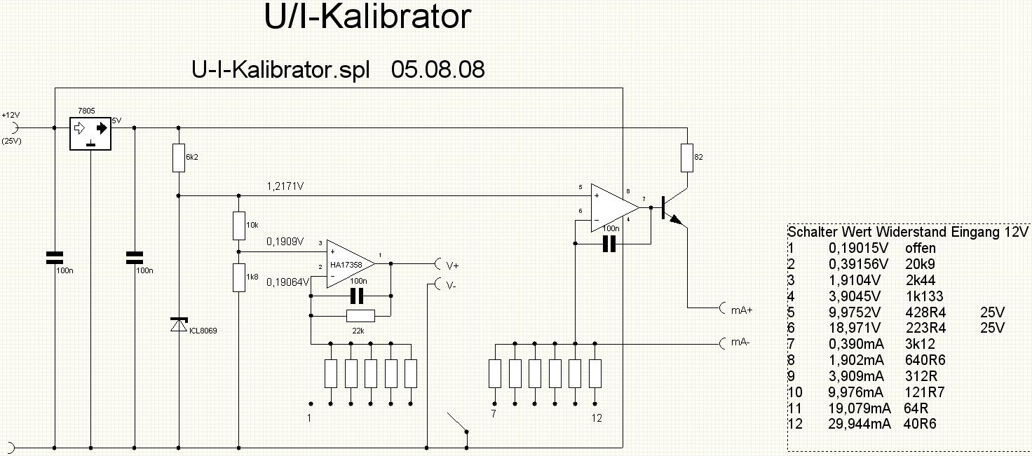 Ich hatte mal kurzzeitig die Gelegenheit, einen Fluke-Calibrator774 auszuleihen. Um auch später meine Messgeräte überprüfen zu können, hatte ich mir einen Strom/Spannungs-Kalibrator gebaut, den ich mit dem Fluke genau vermessen hatte. Es kam also nicht auf die Genauigkeit der Bauteile an, sondern auf die Langzeitstabilität. Das Ziel war die gängigen Messbereiche von 3½ bis 4¾ etwa im Vollausschlag zu überprüfen. Ich musste leider die vorhandenen Bauteile verwenden, da ich den Fluke wieder abgeben musste - nach diesem Thread würde ich andere Bauteile wählen. Ihr habt sicherlich Vorschläge, wie man es besser machen könnte. Ich bin nicht der Genauigkeits-Fanatiker. Es ging nur um die Nachkalibrierung meines DVM-Parks. Dies ist nur eine Anregung. Man kann auf diese Weise ein "Normal" bauen und es irgendwo zum vermessen hin tragen.