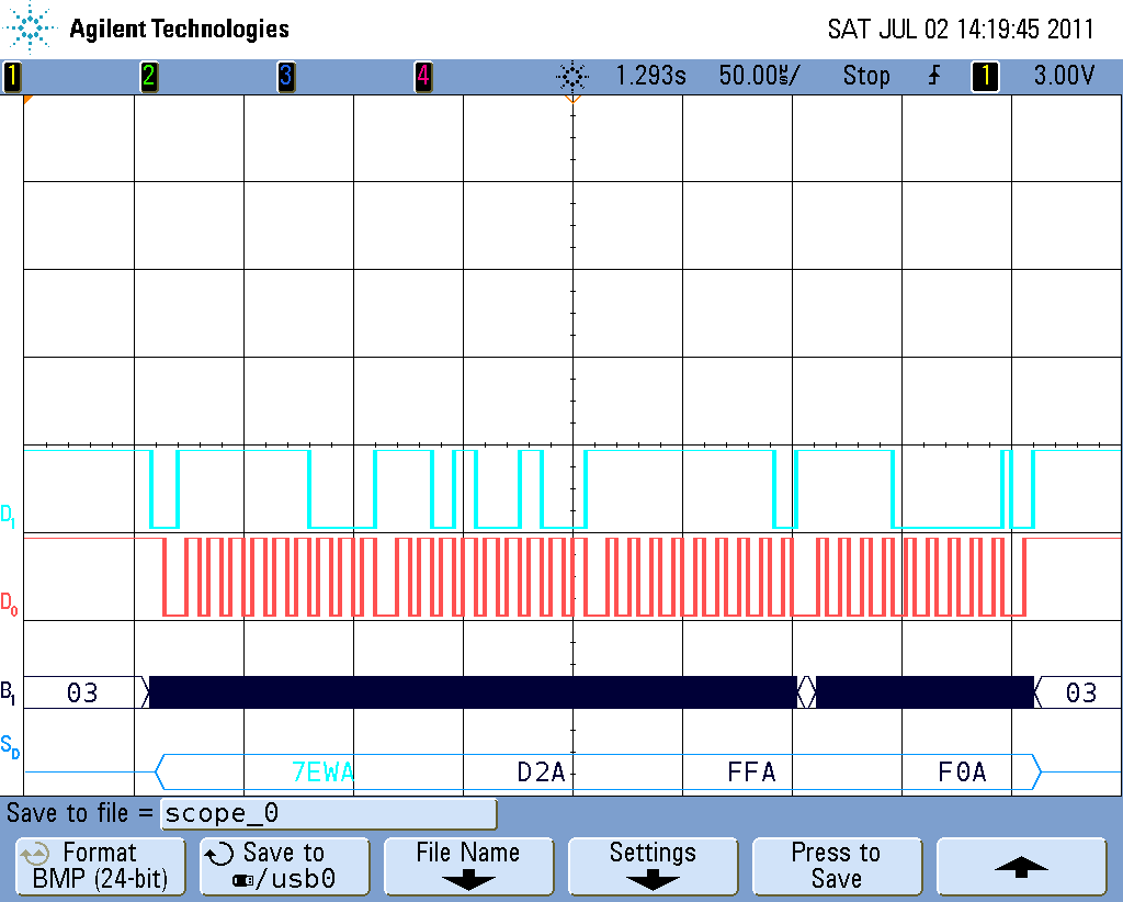 Screenshot des Oszis siehe Anhang. Also der Master soll an den Slave mit der Adresse (0xfe) Daten senden. Den Slave habe ich genau mit dieser Adresse eingerichtet (siehe setup() des Slaves). Das niederwertigste Bit der Adresse stellt nun das R/W-Bit dar, eine "null" bedeutet "Master will senden", richtig soweit? Auf dem Screenshot ist deutlich die Adresse (türkis) sowie die übermittelten Daten (dunkelblau) zu erkennen. Aufgrund der Anzeige der Adresse von 0x7e lässt sich schlussfolgern, dass das höchstwertigste Bit offensichtlich von der Arduinosoftware ignoriert wird. Oder habe ich tatsächlich einen ganz doofen Denkfehler? lg Torsten