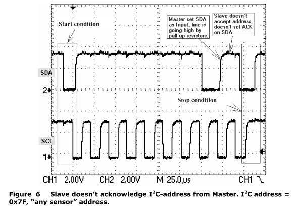 Hallo Du gibst 7FH als Adresse vor. Und genau das siehst du auch auf dem dem Bild SDA.jpg. Wenn die Adresse stimmt, sollte der slave SDA auf low ziehen. Gruß Joachim