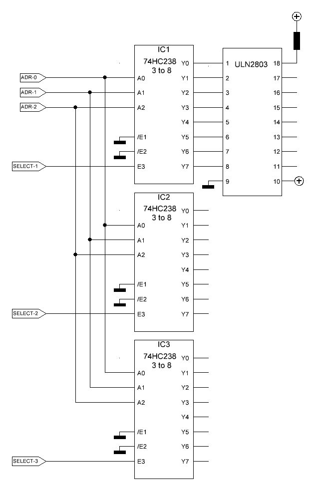 mc t3 schrieb: > Also das mit dem 74hc238 gefällt mir. Allerdings kann ich doch nur 8 > Kombinationen rüberschieben, wenn der 3 Anschlüsse hat. Müsste ich die > dann nicht alle nebeneinander anschließen? So wie in der Zeichnung oben aufgeführt. Mit dem signal "select-1..3" wählst du den gewünschten 74hc238 aus, und mit dem signal "a0..a2" schaltest du einen der 8 ausgänge so sind es 24 Ausgänge, mit einem port "select" mehr kannst du 32 schalten