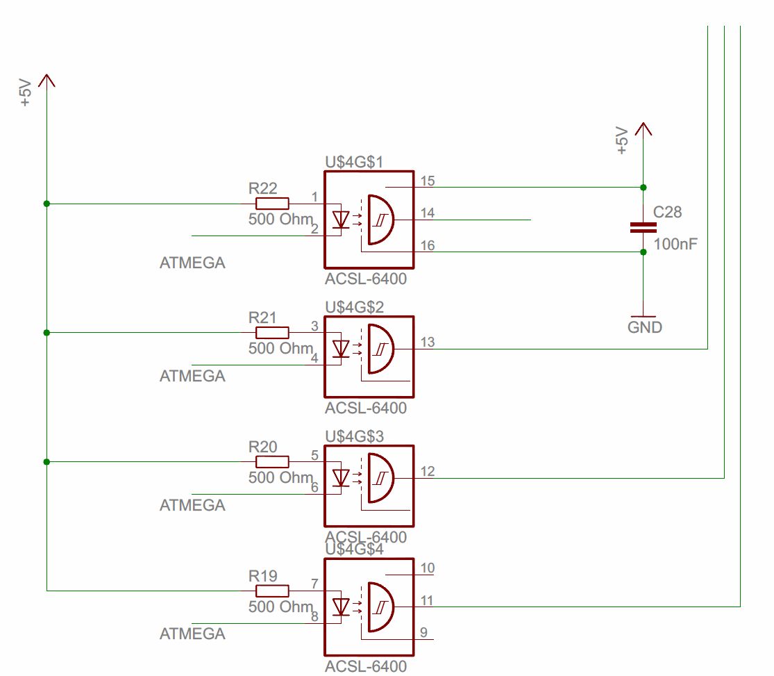 Einen schönen Guten Abend liebe Community, ich habe da ein kleines Problemchen mit dem obigen Optokoppler und der Beschaltung im Anhang, eigentlich möchte ich, dass über die Eingangsseiten 10 mA fließen, das sollte laut Datenblatt ja in Ordnung gehen, und Ausgangsseitig würde ich auch etwa 10mA oder auch 12 brauchen, aber irgendwie krieg ich auf der Photodiodenseite gar nichts raus egal ob die ATmegaanschlüsse Massepotential haben oder 5V. Hat vielleicht jemand eine Idee woran das liegen könnte? Schöne Grüße und angenehme Bettruhe, Alois