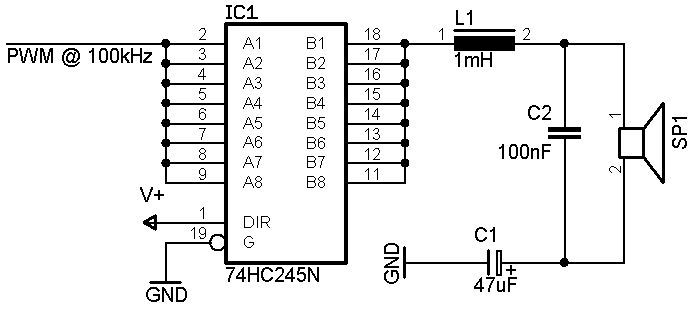 Alle 8 Ausgänge eines 74HC245 bringen schon ordentlich Audio Leistung, das könnte man fast schon als Zimmerlautstärke bezeichnen... Auf jedenfall ist der Vorteil diese Schaltung der hohe Wirkungsgrad (>90%) und der niedrige Ruhestrombedarf (512kByte Flash, ATTiny15, 74HC245) brauchen gerade mal 1uA bei 3V, wovon der HC245 das meiste benötig. Leicht kritisch ist C1, denn wenn dieser einen hohen Leckstrom hat und der Ausgang auf High Pegel bleibt, dann fließen hier einige uA mehr. Anfangs hatte ich OE\ auf High Pegel gelegt, aber dann zieht der HC245 rund 2mA ! Im Betrieb fließen rund 2-5mA in die Endstufe, die an einem 16 Ohm Lautsprecher rund 2Vss bei 3V Betriebsspannung liefert. Optimal ist das ganze warscheinlich bei etwa 16-100Ohm, je nach Betriebsspannung. Für einen Kopfhörer reicht das auf jedenfall, und die Klangqualität ist nicht mal so schlecht, eigentlich sogar recht gut.
