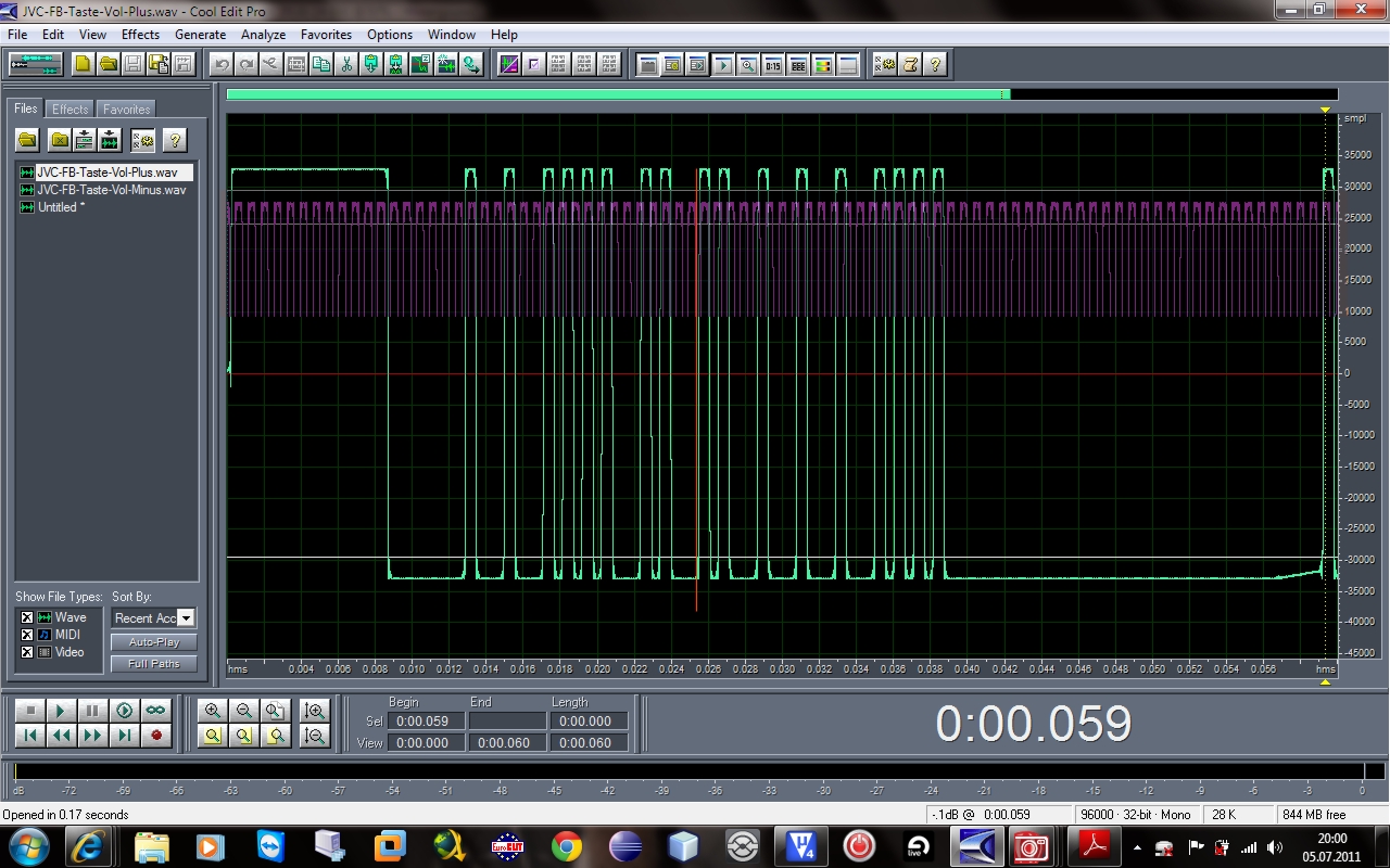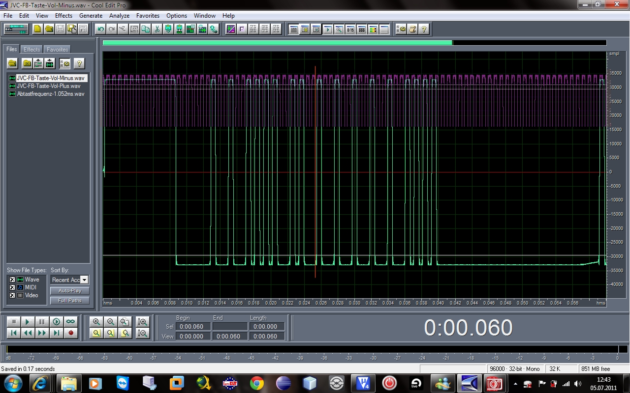 Hallo zusammen, habe schon gesucht aber nichts passendes gefunden, alle ähnlichen Beiträge nur für ATmega leider. Ich möchte gern die FB Signale einer JVC Ferbedienung (Hifi) mit einem µC empfangen, decodieren und die Werte per RS232 einen PC übergeben. Es steht also vorher fest welche Frequenz und welcher Code ausgewertet werden soll. Zudem würde es auch reichen, das Betätigen zweier unterschiedlichen Tasten anzuzeigen bzw. auszugeben. Die Idee dahinter ist: -Per TSOP empfange und demoduliere ich das IR Signal. -Mit einem KEIL MCB2300 mit LPC2378 Prozessor der auf 12Mhz läuft, soll das empfangene Signal abgetastet und als Bitmuster in einem Array gespeichert werden. -Dieses Array wird dann alle 250ms ausgelesen, die entscheidenden Bits ausgewertet (8 Kommandobits) und diesen Zuständen jeweils eine Ausgabe zugewiesen die dann über Com0 oder Com1 des Keil Boards an den PC übergeben werden. -Mit einem Monitorprogramm(Java) werden dann die Nachrichten vom Keil Board ausgelesen und dargestellt. Mein Ansatz ====================================================================== Folgende Funktionsblöcke denke ich, sind hierfür nötig: -ein Timer der zyklisch einen Eingangspin abtastet und so das demodulierte IR-Signal in den LPC2378 "holt". -Ein Synchronisationsblock der erkennt wann Keine Taste gedrückt wird bzw. wann eine Taste gedrückt wird und die Befüllung eines Arrays zum richtigen Zeitpunkt startet. -Ein Array das die empfangenen Daten zwischenspeichert -Eine Funktion die die Bits(0-7) vom Kommandobereich ausliest und auswertet -Eine Funktion die die ausgewerteten Daten über COM(n)an den PC sendet Was bisher funktioniert: -Empfangen der IR Signale am Eingangspin (Darstellen des Signalverlaufes am Audioeingang mit Cool Edit) -Setzen des Timers -Abtasten der Signalbursts mit 700µs ~1,429Khz Takt (warum 700µs, eine logische 1 ist 2,1ms und eine logische 0 1,05ms lang - bei 3 Abtastungen pro gesendetem Bit sollte eine eindeutige Abtastung möglich sein) -Senden der Daten per RS232 und Darstellen der Daten auf dem PC per Monitorprogramm Probleme und Grund dieses Threads: ====================================================================== 1. Um die Daten richtig interpretieren und auswerten zu können, muss die Abtastung mit dem FB-Signal synchronisiert werden, da sonst mit Sicherheit das Array zwar beschrieben wird, allerdings nur mit Datenmüll. Dieses Synchronisieren funktioniert leider noch nicht und ich habe auch noch keinen zuverlässigen Ansatz dafür. Meine Idee hierzu war: Am Anfang eines Signalbursts der FB wird ein Startbit von 8,4ms Länge gesendet, gefolgt von einer Pause von 4,2ms. Danach beginnt der Datenteil ,mit 8Bit Gerätecode und weiteren 8Bit Kommandocode gefolgt von einem Stopbit. Danach gibt es eine Pause von (x)Millisekunden, die je nach gesendeten Daten etwas varriert, bevor der nächte Burst kommt, der allerdings ohne Startbit und folgender Pause gesendet wird. ->Wenn also der Eingang zwischen 4ms und 8ms logisch 1 ist, handelt es sich mit Sicherheit um das Startbit ->Ist also das Startbit erkannt, kann die Datenabtastung und Befüllung des Arrays beginnen. Dazu zählt ein zweiter Zähler solange bis der Anfang des sich wiederholenden Datenblocks beginnt, genau da wird der Zähler wieder auf Null gesetzt und das Array wird erneut beschrieben ->Der Kommandocode ist bekannt und die entscheidenden Bits werden mit dem Arrayinhalt verglichen Aber hier zeigt sich das Problem: Es scheint keine Synchronität zu geben. Nach Beschalten einer LED als Bestätigung einer Taste blinkt diese bei jeder Taste auf, obwohl die Bedingungen für die entscheidenden Bits gesetzt wurden. Es sieht aus als würden die Daten so durchlaufen und irgenwann mal zufällig die Bedingung für ein bestimmtes Kommando stimmen. Wie würde ein zuverlässiger Ansatz für eine Synchronisierung aussehen und mit welcher Abtastrate sollte bei einer Flankenbreite von 0,6ms typischerweise abgetastet werden? Ich hatte 0,7ms also 0,35ms Puls/Pause gewählt. Ist es überhaupt korrekt mit einer if Abfrage auf die passenden Bedingungen zu prüfen? 2. Beim Timing kommt irgendwann das Problem, dass je mehr Anweisungen und Funktionen der Prozessor ausführen muss, das Timing nicht mehr stimmt und somit gar nichts mehr. Eigentlich sollte doch bei 12Mhz genug Zeit sein die Bedingungen abzufragen, das Array zu beschreiben und auszulesen sowie die Daten zu versenden. Vermutlich geht das Timing bei Funktionen die auf Eingaben warten kaputt z.b printf oder lcd_print, denn da funktioniert der Timer nicht mehr , verändert alle Zeiten irgendwie. ======================================================================== == Vielleicht hat ja jemand die Zeit sich das alles mal durchzulesen. Möglicherweise machts ja gleich "achsoooo" und ich mache nur grundlegende Fehler. Der Code ist noch ziemlich durcheinander, aber ich hänge ihn mit an damit Ihr Euch das mal ansehen könnt. Für ein paar Anregungen wäre ich dankbar... Tom