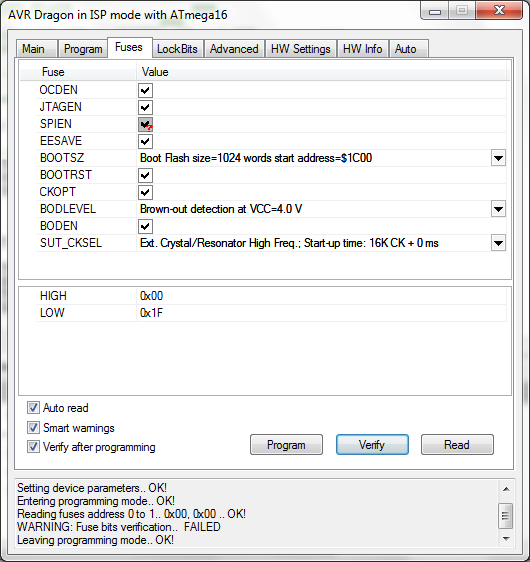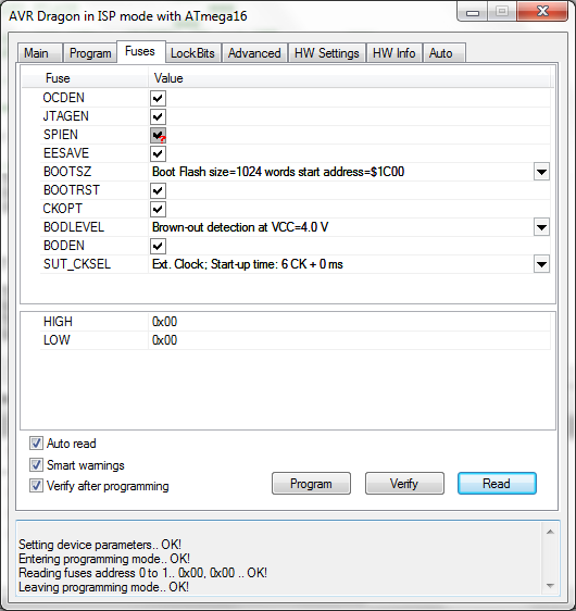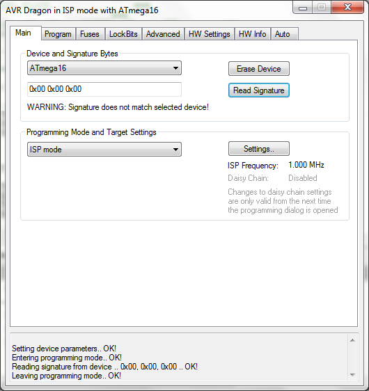 Hallo Miteinander Ich will in die Mikrokontrollerprogrammierung einsteigen und so habe ich mir ein STK200-Dragon von Kanda(http://www.kanda.com/products/kanda/STK200.html) zugelegt. Ich habe die Software(AVRStudio 4.18) auf der mitgelieferten CD installiert, die Hardware mit der zugehörigen Anleitung verkabelt und die Verbindung zum Computer hergestellt. Die LED leuchtet grün, der ATMega16 ist werksmässig eingesteckt. Soweit so gut... Nun habe ich das Problem, dass beim Lesen der Signature immer "WARNING: Signature does not match the selected device" erscheint(Siehe Anhang). Ein Fuse wird nicht richtig gelesen, der Clock-Fuse kann ich nicht richtig setzten(Siehe Anhang). Ich hoffe ihr könnt mir helfen. Greez Sevi
