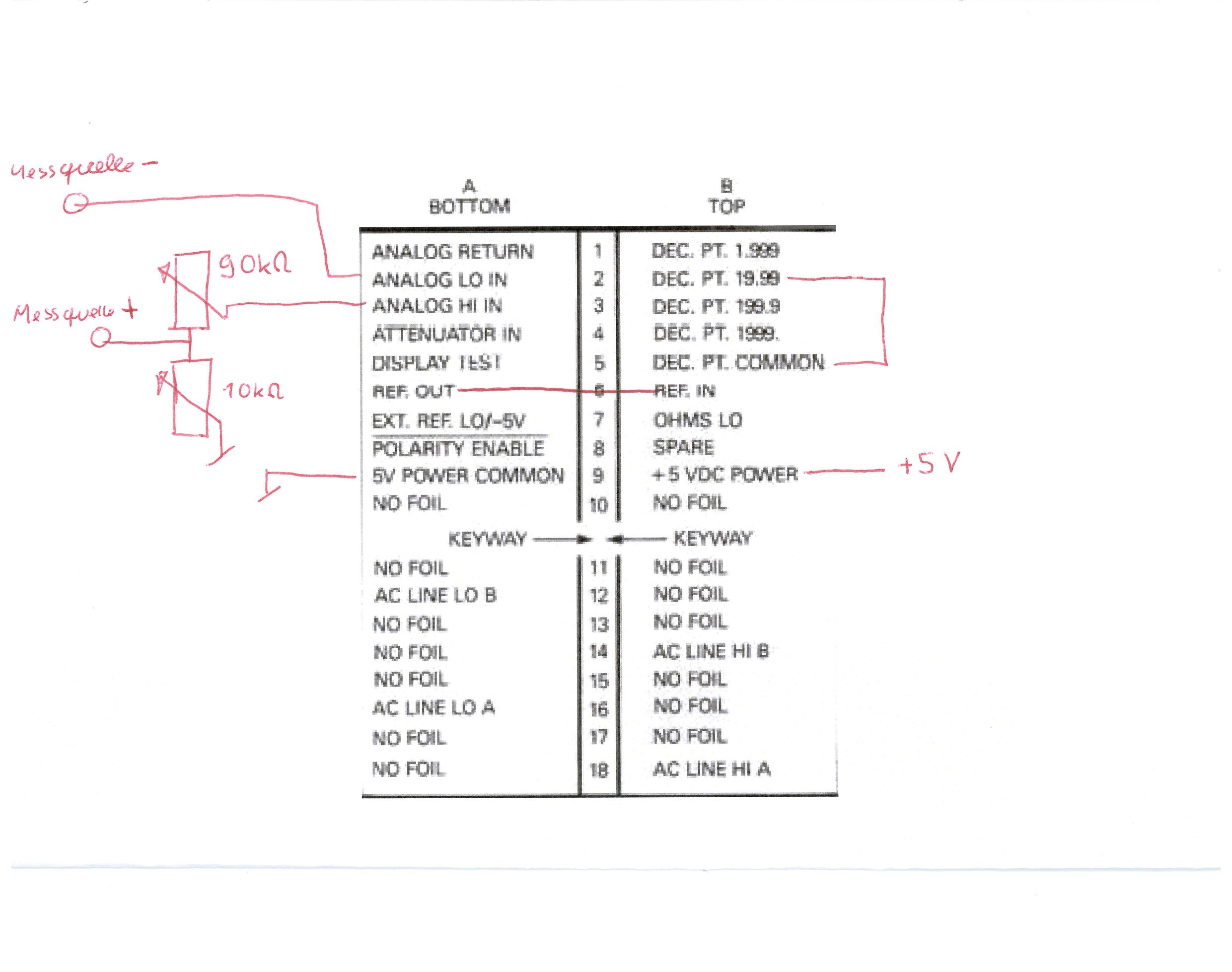 Hast Du Analog.Low.In mit Analog.Return verbunden? Mach das mal. Wenn Du die Widerstände bestückt hast, ist Dein positiver Eingang jetzt Attenuator.In. Der Spannungsteiler mit den Potis in Deiner vorherigen Skizze war falsch beschaltet. Welche Brücke weggetan? Für den Dezimalpunkt?