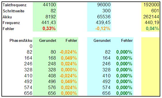 Aber es gibt doch ein Ganzzahlprolem!(?) Der Akku wird mit einem Wert addiert, der dazu führt, das nach der Zahl der Takte/Sekunde zu einem kompletten Akkuüberlauf führt. Wenn aber die gwünschte Freuquenz nicht ganzzahlig zur Taktfrequenz üpasst, geht es nicht ganz genau.