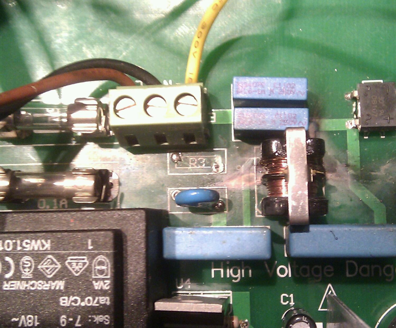 Du hast den Schriftzug High Voltage Danger gelesen? == sehr gefährlich!!! Das Bauteil ist ein Varistor. Aber auch die Spule sieht mitgenommen aus. Ohne Kenntnis ein paar Bauteile tauschen ist nicht empfehlenswert. Ohne Maßnahmen zum Personenschutz sollte man nicht an Netzteilen basteln.