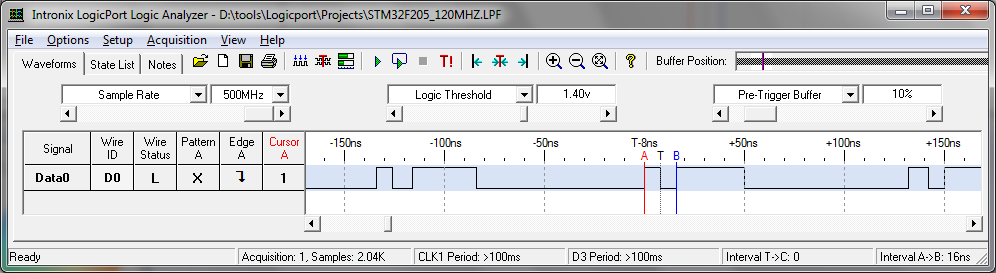 Wie auch an den Adressen zu erkennen ist, läuft der Code im Flash. Nun Logicport an den Pin gehängt, Ergebnis hängt bei. Was man nun erkennen kann: * Es ist möglich die I/Os in 8,33ns umzuschalten. * Der Sprung an den Anfang der Schleife dauert vergleichsweise lange (hier schwächelt der Flash Beschleuniger) * Die gesamte Schleife braucht 144ns. Das entspräche dann im Schnitt 1 Waitstate. ST verspricht eigentlich 0 Waitstate performance. Naja. Gut, Wenn man ein Programm ohne Sprünge hat? (ist halt Marketingmännisch gerundet). Egal wie, langsam würde ich das nun aber gleicht garnicht nennen. Vor allem für einen 6EUR controller... wer in der Preisregion schnelleres hat, bitte gerne... (Kinetis?) Ach ja: Die F103 dürften bei 72MHz nicht ganz halb so schnell sein.