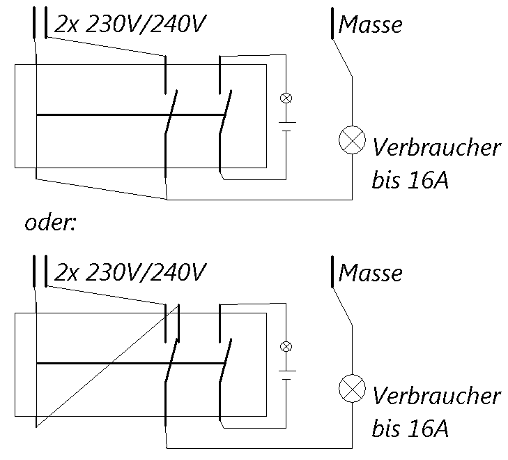 Hallo, kurz vorweg, ich bin kein Elektriker, versuche aber das Problem so gut wie möglich zu beschreiben, sowie eine mögliche Lösungsidee. Ich habe zwei eingehende 230VAC Leitungen, dabei fällt eine Leitung manchmal aus, die zweite Leitung kommt von einem Generator und liefert nur Strom wenn der Generator über ein digitales Signal gestartet wird. Nun habe ich vor ein Relais oder Schütz einzusetzen und dieses mit der Leitung die normal auch als Ausgangsleitung genutzt werden soll schalten zu lassen. Sollte auf dieser normalen leitung der Kontakt unterbrochen sein (100%), soll das Relais/Schütz schalten und die zweite Leitung soll geschaltet sein, über einen weiteren Kontakt soll dies ablesbar sein und so der Generator gestartet werden. Die Leitung soll mit bis zu 230VAC/16A belastbar sein, der erste Verbraucher ist ein Notstromaggregat. Nun meine Frage: Gibt es ein Relais/Schütz das dies leisten kann? Ist die Schlatung so machbar/sicher? Gibt es villeicht eine einfachere Möglichkeit, die villeicht auch nicht soviel Verlust hat und sicherer ist? Ich denke da an ein Messgerät, das die Spannung misst und ein Relais schaltet wenn die Spannung zu gering wird. Ich habe das ganze 2x gezeichnet und mit hochgeladen. Gruß Markus