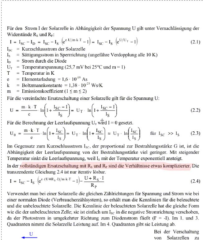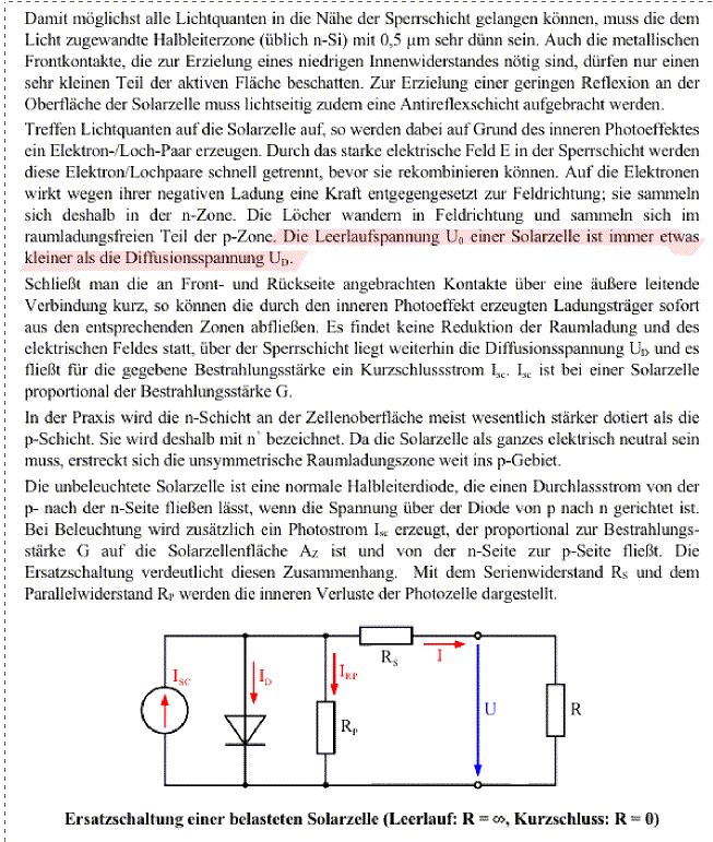 Du hast aber schon mal in das verlinkte Script geschaut: I = Isc - Id mit Id = Is x (e ^ (U / Ut) - 1) wobei I der äußere Strom, Isc der Kurzschlussstrom, Id der Strom durch die Diode, Is der Sättigungssperrstrom, Ut die Temperaturspannung Wenn I = 0, muss Id = Isc werden, dazu steigt U entsprechend an bis U = U0. Das passt schon, ich bring das nur nur nicht mit U0 < Ud, Ud Diffusionsspannung überein. Muss aber vielleicht auch nicht, wenn der Diodenstrom schon für U unterhalb der Diffusionsspannung Ud ausreichend hoch wird.