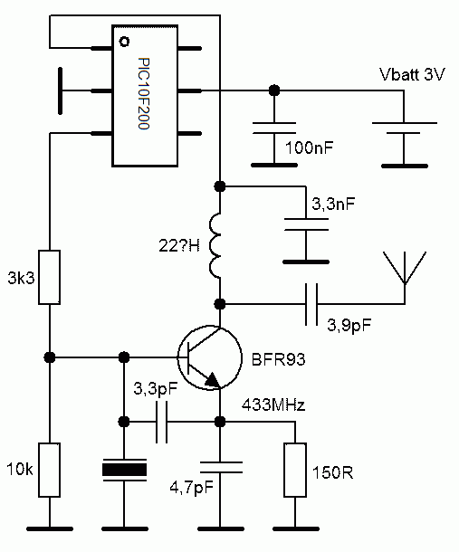 Ein Beispiel für einen sehr kleinen Peilsender: der PIC aktiviert 1mal pro Sekunde für eine kurze Zeit den HF-Teil und moduliert dann über eine zweite Verbindung zum Sender die HF.