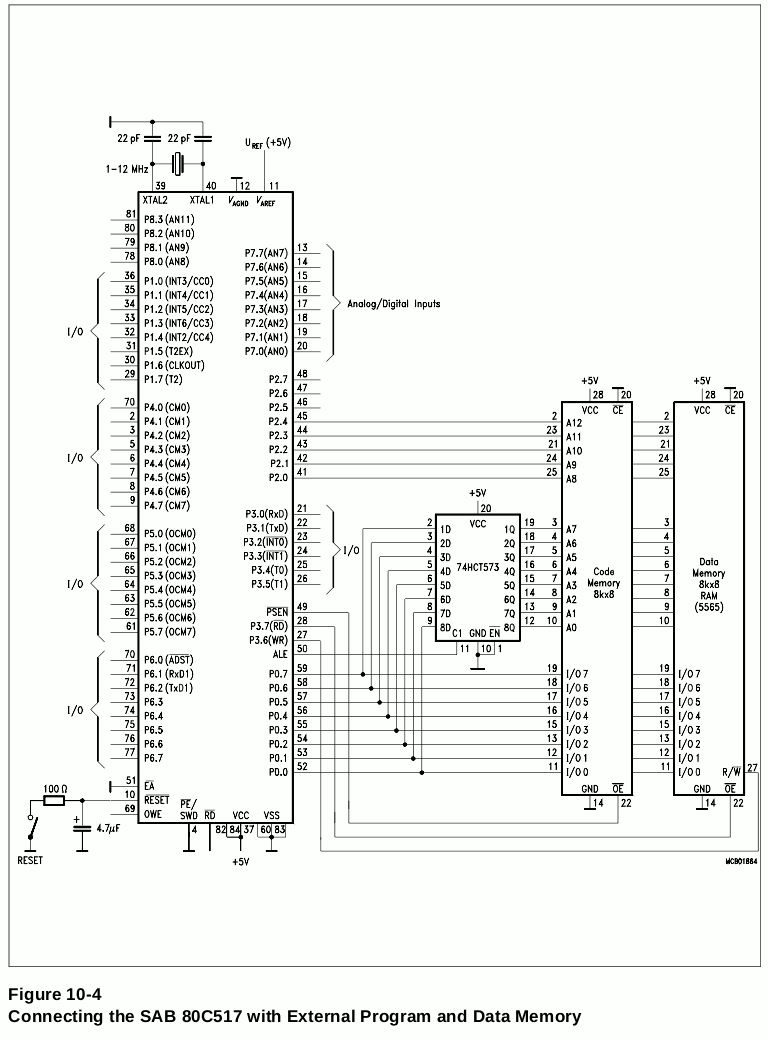 Andreas Bachmann schrieb: > Wie kann ich auf das externe Memory zugreifen? So wies aussieht, kann > ich 16 Bit adressieren: 64 kB externes RAM 64kB RAM + 64kB ROM Andreas Bachmann schrieb: > Da ich noch nie einen MAX232 benutzt habe, kann es sein, dass > ich etwas falsch angeschlossen habe... Viele Leute setzen den Kondensator an Pin 2 wie in Deiner Schaltung gegen Vcc. Das halte ich für unelegant. Bei einem Fehler kann negatives Potenzial an diesem liegen. In dem zweiten pdf sind die Kondensatoren an V+ und V- auch noch verpolt. Andreas Bachmann schrieb: > Wie kann ich mit Assembler bzw. C über externen Bus zugreifen? Mit MOVX (RAM) und MOVC (ROM) Andreas Bachmann schrieb: > Carlos schrieb >> Um einen externen Speicher hinzuzufügen benötigst Du aber auf jeden Fall >> noch ein externes Latch (74xx573) am Port P0, um Daten und Adressen zu >> trennen. > Ja, natürlich... habe ein gutes PDF gefunden: Das geht genau wie beim 80c517 - nur die Pin-Zuordnung ändert sich evtl. Siehe Bild aus Siemens 80c517 datasheet. Gruß Jobst