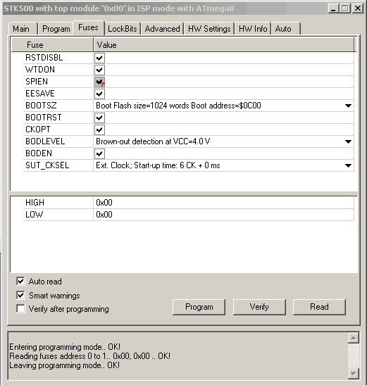 Hab mal das Tool AVR-Brenner zum auslesen der Fuse-Bits benutzt. Das sagt mir "unbekannter Prozessor". Ich versuche heute Nachmittag nochmal mein Glück und werde berichten. Gruß Mosfreak