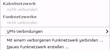 Auf einem KNOPPIX 6 PC versuche ich eine WLAN- / Internet-Verbindung zu einer Fritzbox aufzubauen. Nach dem Klick auf Netzwerksymbol hätte ich erwartet, dass ich die Netzwerke in der Nähe angezeigt bekomme (Bild 2). Es geschieht aber nichts. Wenn ich auf "neues Funknetzwerk erstellen ..." klicke, dann erhalte ich zwar ein Netzwerk (Bild). Aber dies ist mein eigenes(?) und auch nach außen nicht sichtbar. Bild 1 und Bild 2 zeigen die beiden Menüs die mir nach einem Rechts- bis Linksklick zur Verfügung stehen. Mit einem XP PC und einem XP Notebook klappt die Verbindung zur FB, nur unter KNOPPIX funktioniert es nicht. Kann mir jemand sagen, was ich machen muss, um eine Verbindung zu bekommen?