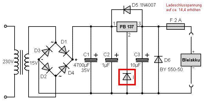 Hallo Zusammen, Ich bin auf der suche nach einer einfachen günstigen Lösung zum Laden von 3 AGM Akku´s die in Reihe betrieben werden, die ich aber aufgrund des mangels an angeboten von 40 VDC Ladegeräten, einzeln laden möchte unzwar mit jeweils einem Ladegerät um die Ladezeit zu verringern. Derzeit handelt es sich um diese Akku´s http://mtk.mtk-handel.de/datenblaetter/Longex12LCP-9.pdf die Ladespannung ist auf den Akku´s mit 14,4 V angegeben bei der suche nach einem einfachen Laderegler bin ich auf den PM137 und der im Anhang gezeigten Beschaltung gestoßen, einzige Änderung die vorgenommen habe ist die Rot gegenzeichnete Diode. An dieser Stell vielen dank an http://www.hobby-bastelecke.de daher kommt die schaltung Ich habe mir das so vorgestellt das der Laderegler durch die Diode im Ground eine "flasche" Akkuspannung mist und dadurch ca. 0,6 V (Durchlassspannung der Diode) mehr am Ausgang rausgilbt. Gibt es da Einwände ? möchte ungern das Zeugs bestellen und nachher funktionier es nicht, da es nicht für mich ist. wäre super wenn jemand sich hierzu äussert greetz Fr3gg3L