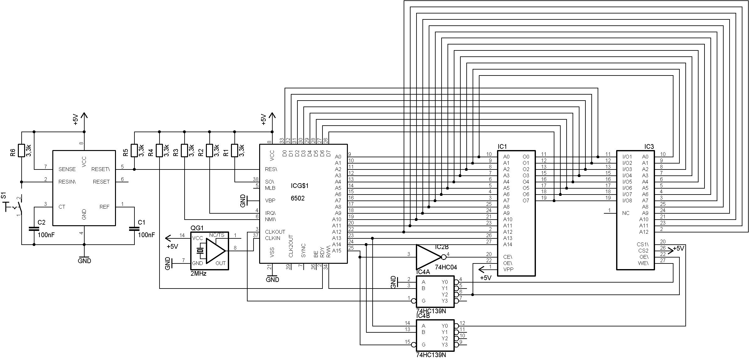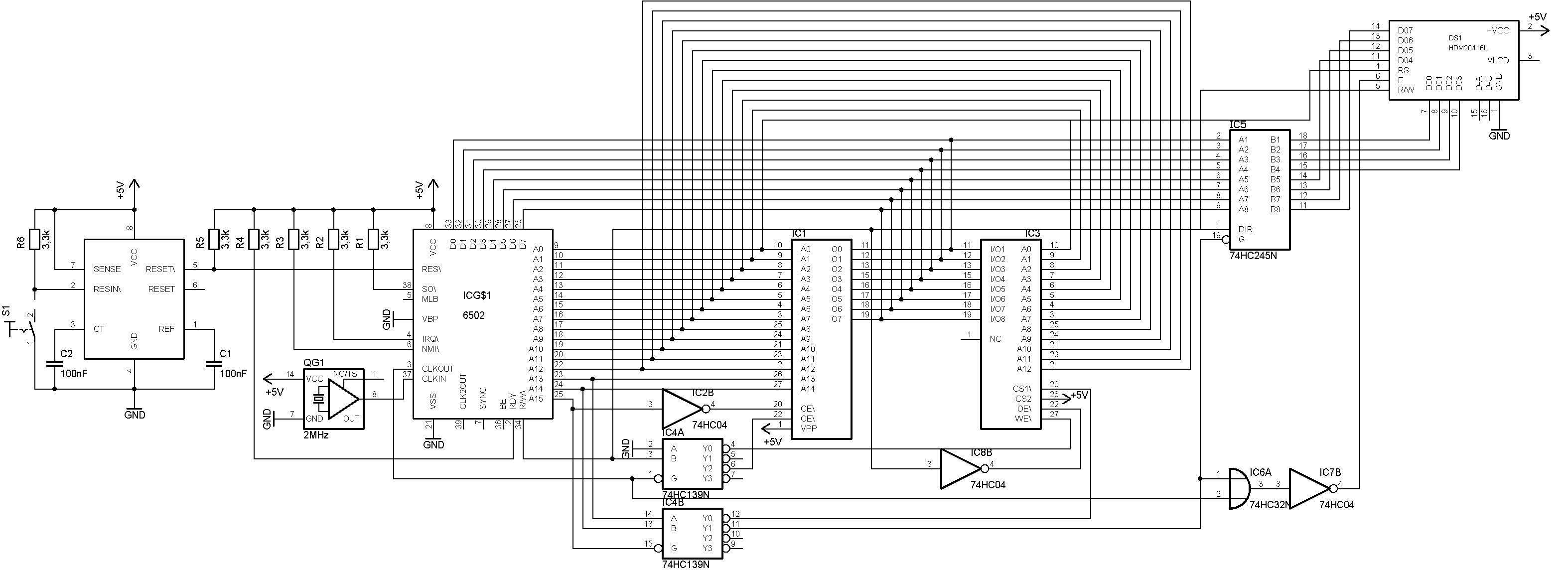 uP: MOS6502AD, 42.KW 1985 (läuft im Moment mit 60kHz) SRAM: IDT7164S EPROM Simulator: CL63C256 über 74HC245 in den Daten, Adress und Steuerleitungen. Jetzt bleibt der uC nur noch beim Lesen des Busy Flags vom LCD hängen, da dieses genauso gelesen wird, wie der SRAM. Ich habe noch die komplette Schaltung mit LCD angehängt, so wie sie im moment aufgebaut ist.