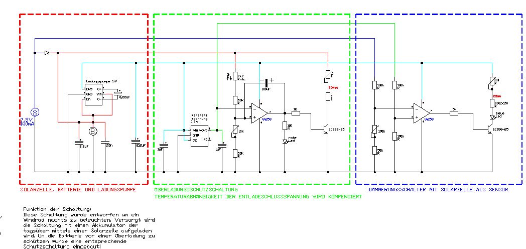 Also ich würd es so machen, das du die Stromquelle an einen Fotowiderstand hängst, diesen an eine Heizspule und diese an einen Bimetallstreifen, der, wenn er sich erhitzt, nach oben gebogen wird. Wird der Lichteinfall schwächer, also die Sonne geht unter, wird der Widerstand größer und die Heizspirale kühlt sich ab. Der Bimetallstreifen kühlt sich also auch ab und senkt sich auf..den Schalter bzw. Schraubenkopf, eben das, was du als Leiter anschließt. Natürlich musst du diesen Kontakt auch mit der Stromquelle verbinden und den Bimetallstreifen ebenfalls. Ich bin auch ein kompletter Frischling in sachen Schaltungen, aber das sollte, wenn ichs mir richtig vorstelle, funktionieren. Vielleicht noch ein Kondensator um den Strom zu "glätten" und die einzelnen Widerstände, die da ggf. rein müssen, die musst du dir aber selber ausrechnen, je nach Batterie und LED etc. pp.^^ LG Erlendur