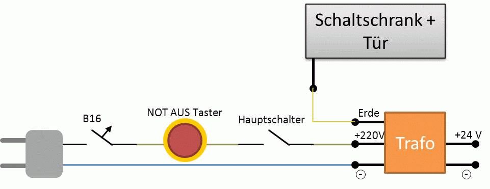 Kurz und bündig: der "Plan" ist mist^^ Kritikpunkte: Schutzleiter: Warum verbindest du die Erde des Trafos mit der des Gehäuses wenn keine der beiden mit der Hauserde verbunden ist??? -> Prüfen ob Steckdosenstecker wirklich ohne Schutzleiter ist. Leitungsschutzschalter: Wie schon geschrieben in der Regel reduntant weil die Steckdose im Normalfall mit 13 oder 16A abgesichert ist -> Dadurch bist du nicht selektiv Not Aus Schalter ist umsonst, denn dieser macht nichts anderes wie der Hauptschalter. Richtiger wäre ein Wiedereinschalten nur durch lösen zu verhindern (z.B. durch zusätzlichen Quittiertaster über not-Aus Relais) Hauptschalter kommt vor alle Anlagenkomponenten und zu deinem Eigenen Schutz empfehle ich dir allpolig zu schalten da ein Hauptschalter meißt sowieso mehr als einen Pol hat. Würde mir überlegen ob du den Trafo nicht durch einen Motorschutzschalter sicherst.