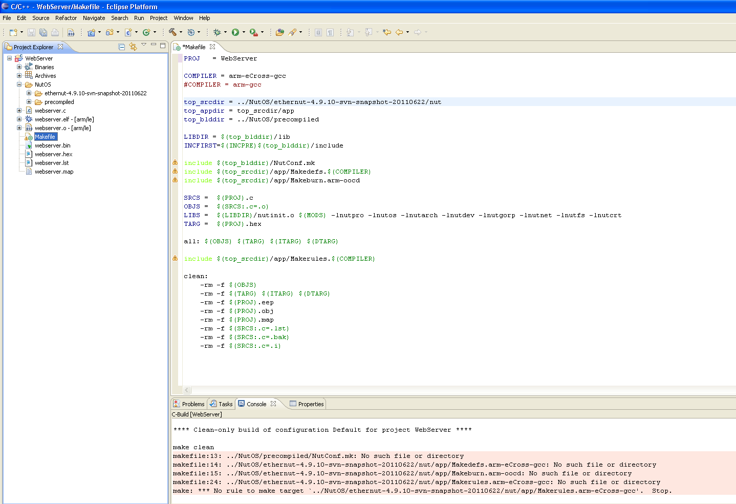 Hallo zusammen, in der letzten Ausgabe des Embedded projekt journals war ein für mich interessanter Beitrag zum einfachen Aufbau eines „embedded web servers“ enthalten. Basis ist ein ARM von Atmel. http://www.embedded-it.de/bsp/demos/webserver_relais.php Ich habe die entsprechende HW aufgebaut bekomme aber die Toolchain unter XP nicht ans Laufen…und hoffe daher auf einen Tip von Euch! Ich möchte nicht auf Kommandozeilenebene arbeiten und setze daher auf ECLIPSE. http://www.yagarto.de/howto/yagarto2/index.html Folgende Komponenten habe ich installiert: YAGARTO TOOLS C:\Programme\yagarto-tools-20100703 YAGARTO C:\PROGRAMME\YAGARTO ECLIPSE C:\PROGRAMME\ECLIPSE C/C++ Development Tooling in ECLIPSE integriert Workspace von ECLIPSE D:\EclipseWorkspace NUTOS C:\ethernut-4.8.9 Anschließend habe ich die Projektdateien in ECLIPSE importiert (Anhang). Bei „clean“ oder „build“ kommt jedoch immer die Fehlermeldung das er verschiedene Verzeichnisse nicht finden kann… „which make.exe“ liefert: C:\programme\winavr\utils\bin\make.exe Grüße K. Ritter